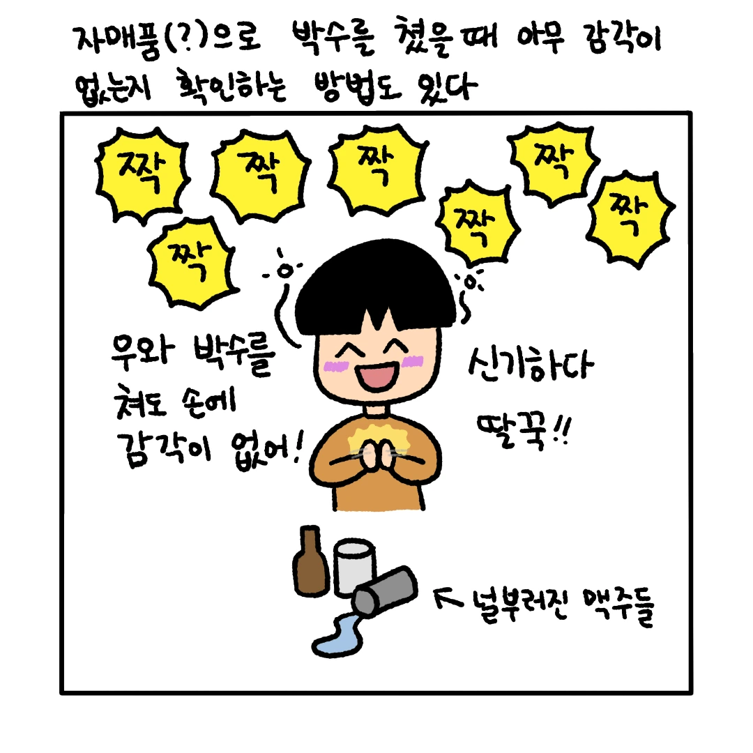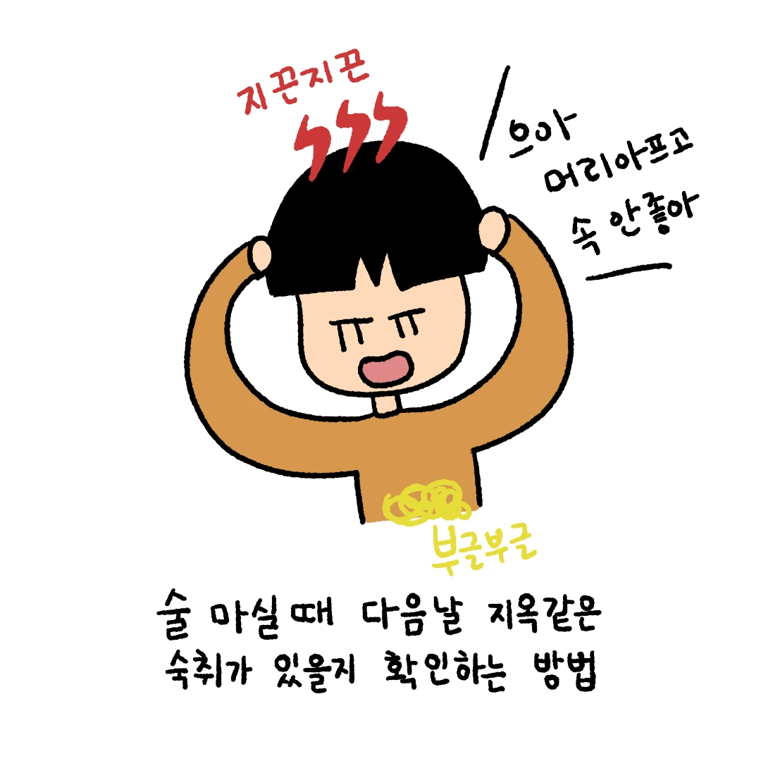 술을 마시고 있을 때 숙취가 있을지 확인하는 방법을 만화로 그려보았습니다. 위의 테스트 방법을 했을 때 해당한다면 술을 더 마시는걸 그만해야겠죠?
