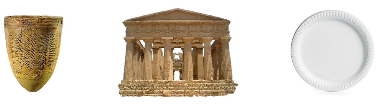 그리고 우리 주변에서 쉽게 볼 수 있는 플라스틱 접시 또한 어떠한 형태로든 쉽게 성형이 가능한 재료의 특징을 가지고 있음에도 불구하고 도자기 접시의 제작 과정에 영향을 받은 형태적 특징을 그대로 담고 있습니다.