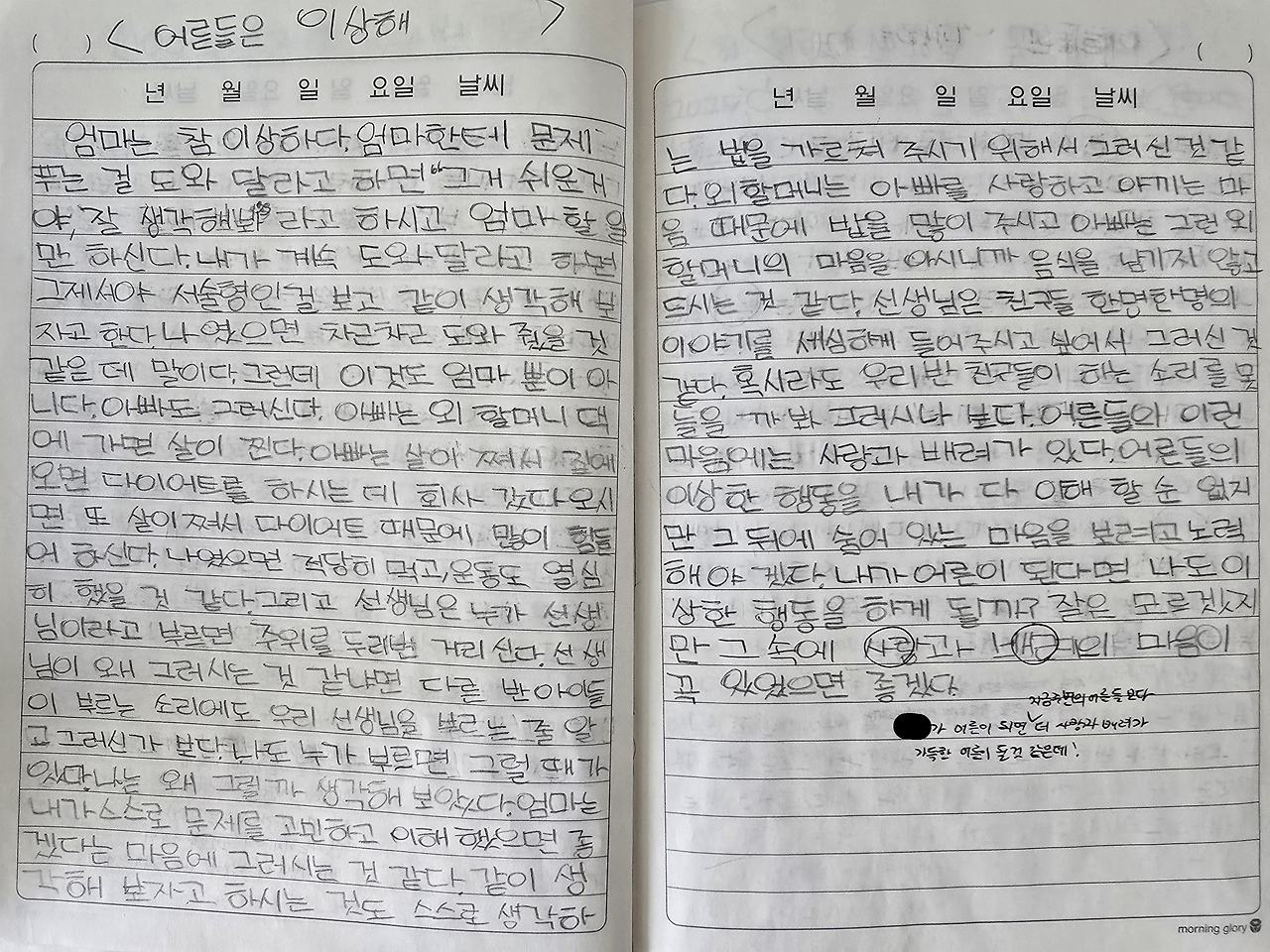 어른들의 이상한 행동을 내가 다 이해할 순 없지만 그 뒤에 숨어있는 마음을 보려고 노력해야겠다.
