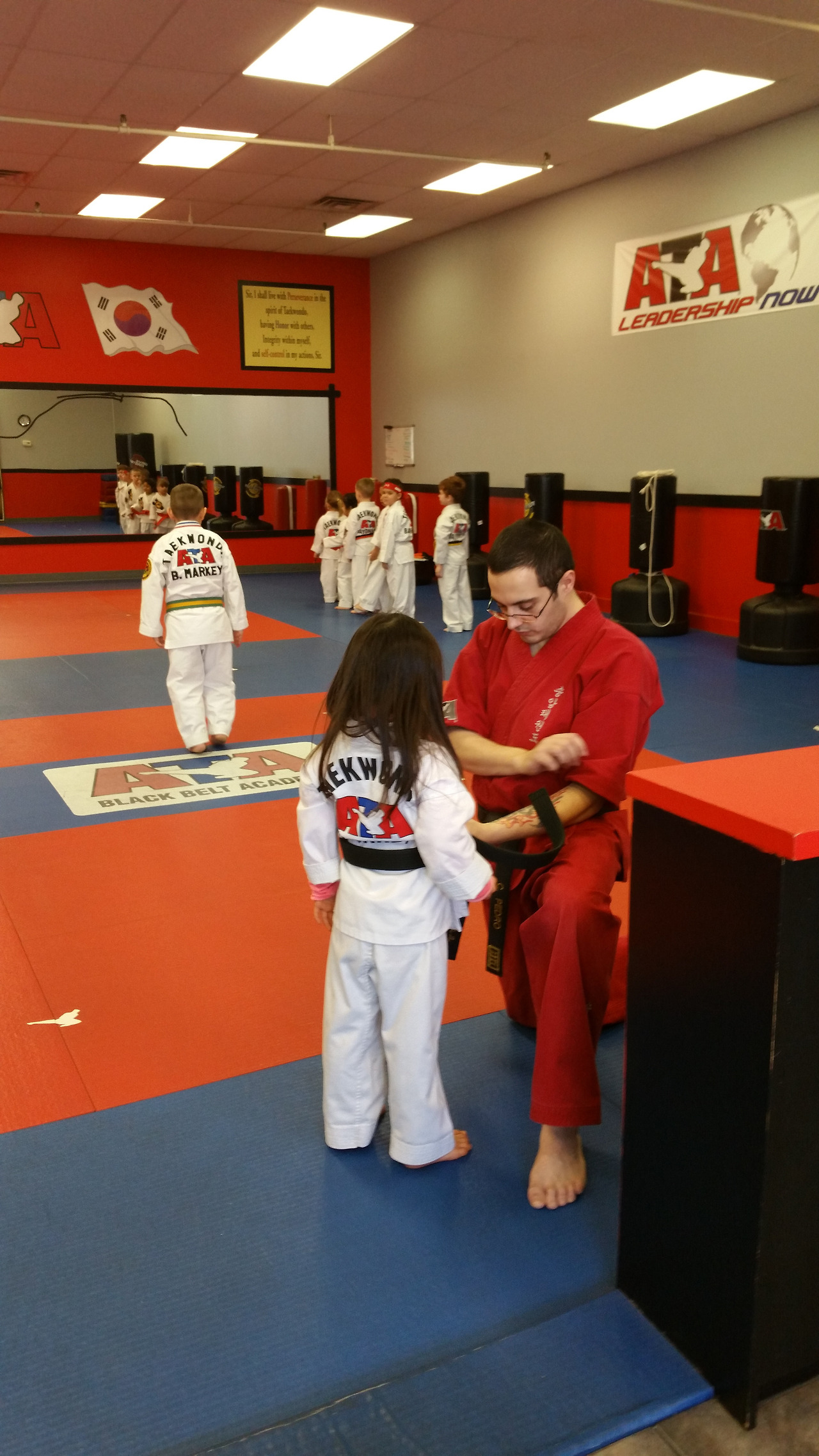태권도 사범님은 생일을 맞은 딸아이에게 특별히 검은띠를 빌려주었다.