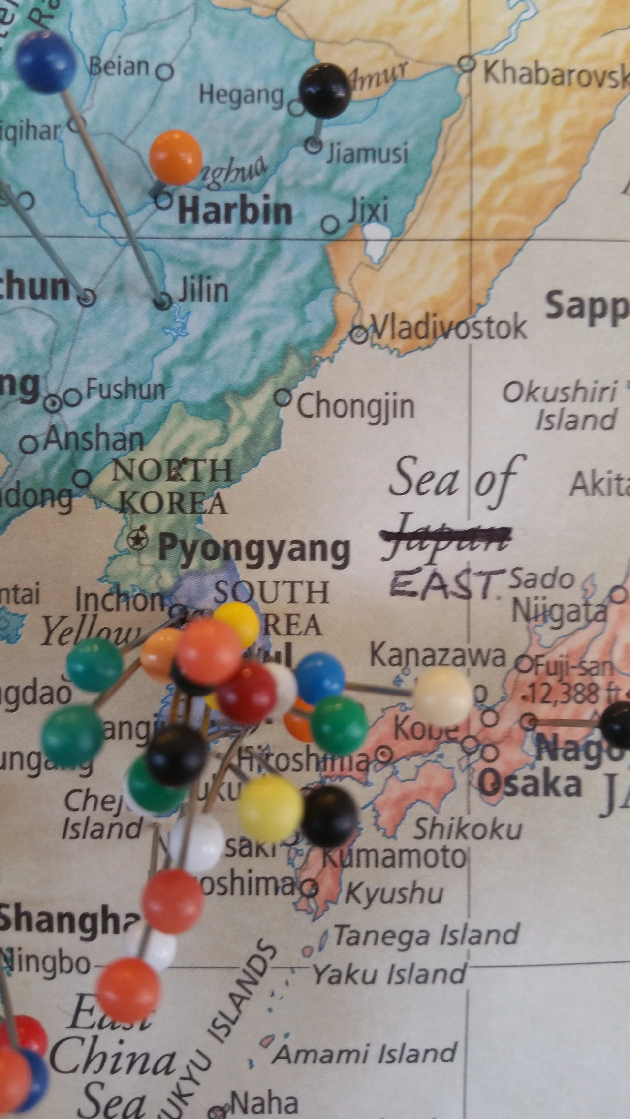 동해는 동해다. 북한에는 누군가 핀을 꽂았다가 뺀 흔적이 있다.