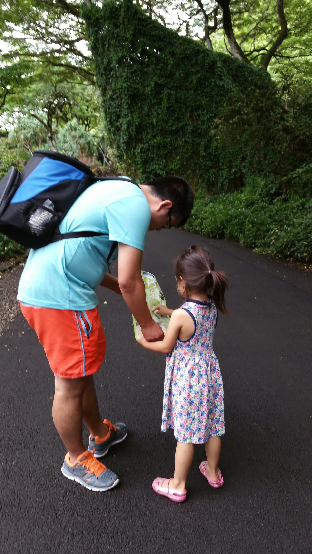 폭포까지 1km 정도 걸어야한다. 폭포가는 길에 둘러볼 나무와 꽃 자리까지 더하면 우리가 얼마나 많이 걷게 될 지 확실하지 않았다. 계곡 길에 들어서자 금방 딸아이가 앵무새처럼 재미없다는 말을 반복한다. 딸아이에게 계곡지도를 쥐어주고 도라가 되어 우리를 폭포까지 안내해달라고 했다. 우리가 딸아이보다 앞장서서 걸으려고 하면 딸아이는 우리더러 자기 뒤를 따라 걸으라고 야단이었다.
