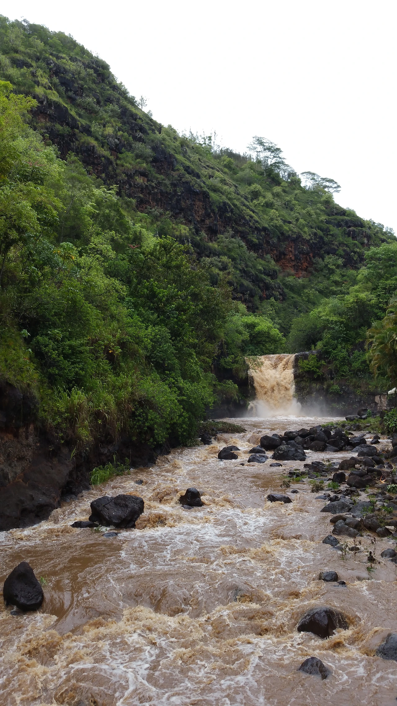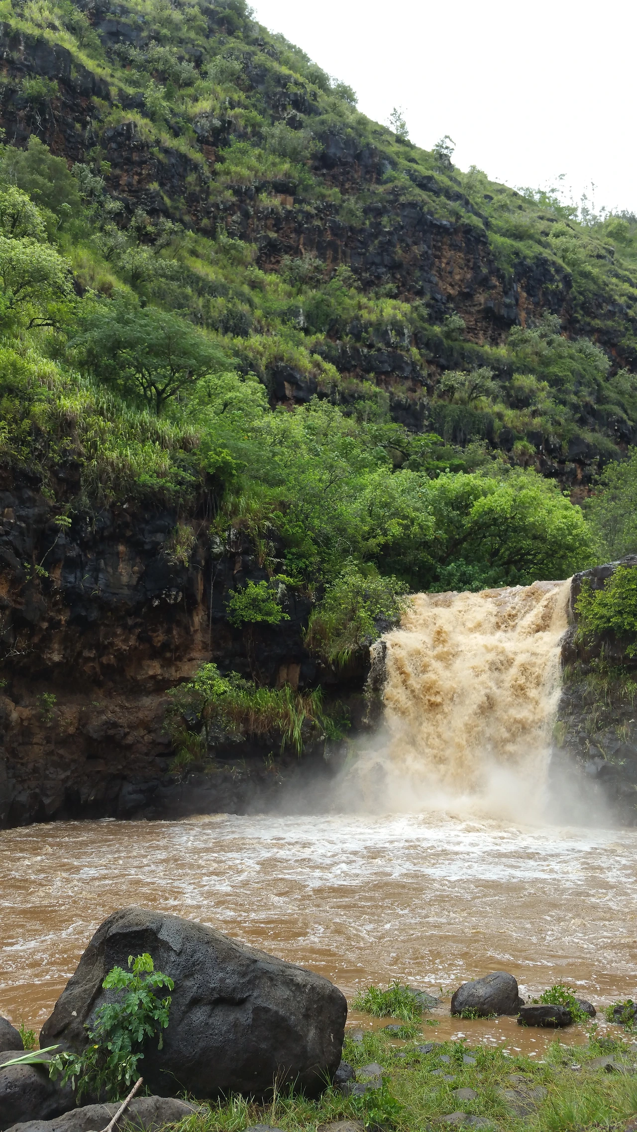 집 밖을 나서는 시간이 점점 늦어진다. 아침 8시, 우리는 차를 타고 폭포를 보러 Waimea Valley에 갔다. 밤새 비가 많이 내렸는지 바다가 흙빛이다. 하와이는 아슬아슬하게 열대폭풍 Kilo의 영향권을 벗어나고 있는 중이다. 그 덕분에 날씨가 많이 덥지 않아서 아이들을 데리고 계곡을 걸어다닐 수 있었다.