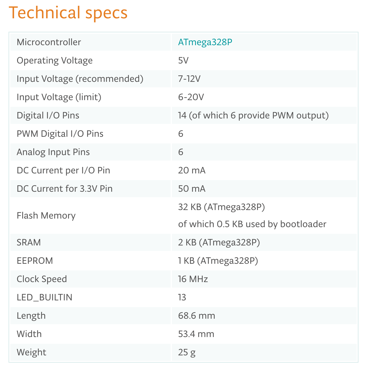 컴퓨터를 구입할 때 컴퓨터 사양에 대해 알아본 사람은 일부 항목이 친숙할 것이다. 뭐가 뭔지 하나도 모르는 사람도 있을 것이다. 여기서 언급한 스펙은 사실 몰라도 당장 아두이노를 하는데 크게 지장은 없다. 하지만 조금이라도 알아 두면 아두이노의 동작에 대해 이해할 때 도움이 될 것이다. 아래는 아두이노의 스펙이다. 혹시 스펙이 어렵다고 느껴지면 일단 건너뛰어도 무방하다.