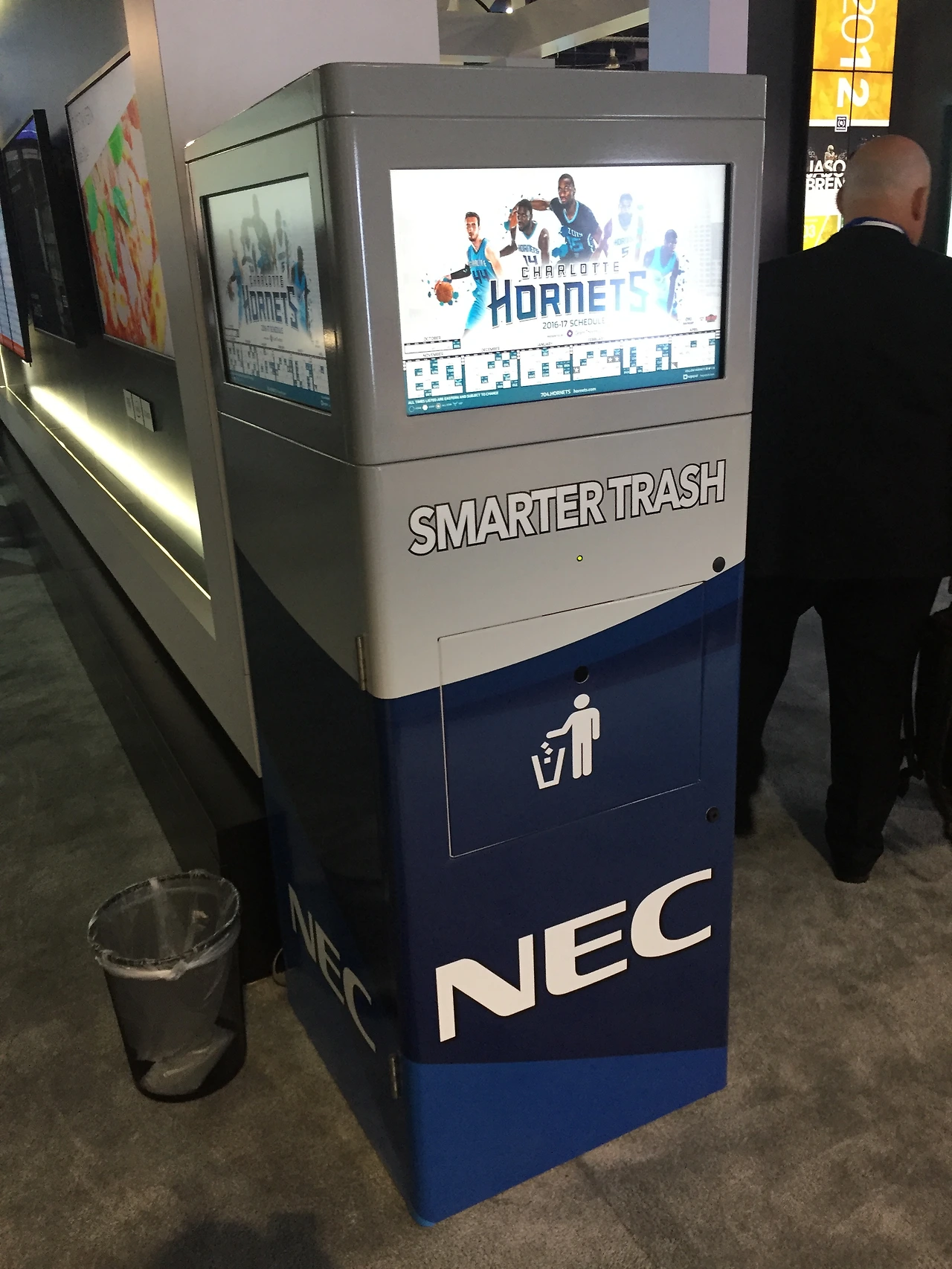 이건 스마트 쓰레기통. 쓰레기통 앞에 가니 자동적으로 뚜껑이 열리고, 광고도 맞춰 플레이되더군요.
