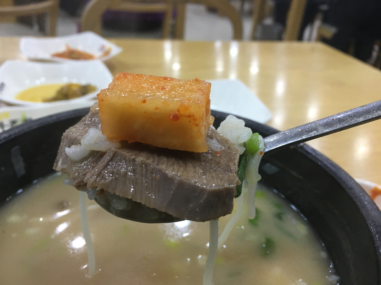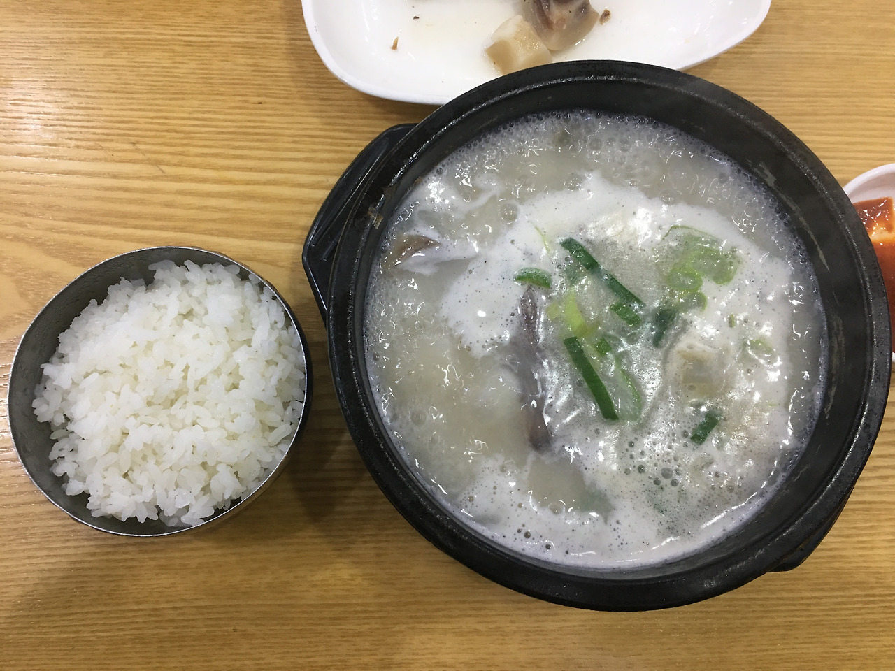 국물은 설렁탕이나 곰탕 국물보다 확연히 진합니다. 적지 않은 재료에 오랜 시간 우려냈다는 반증이기도 합니다. 곁들여 나오는 수육과 탕에 들어 있는 고기는 쫀득하면서도 부드러운 식감입니다. 찬과 함께 나오는 초고추장 소스에 고기를 찍어 먹으면 고기 특유의 느끼함도 사라집니다. 국물 한점 없이 뚝배기를 비우고 나니 속이 든든합니다.