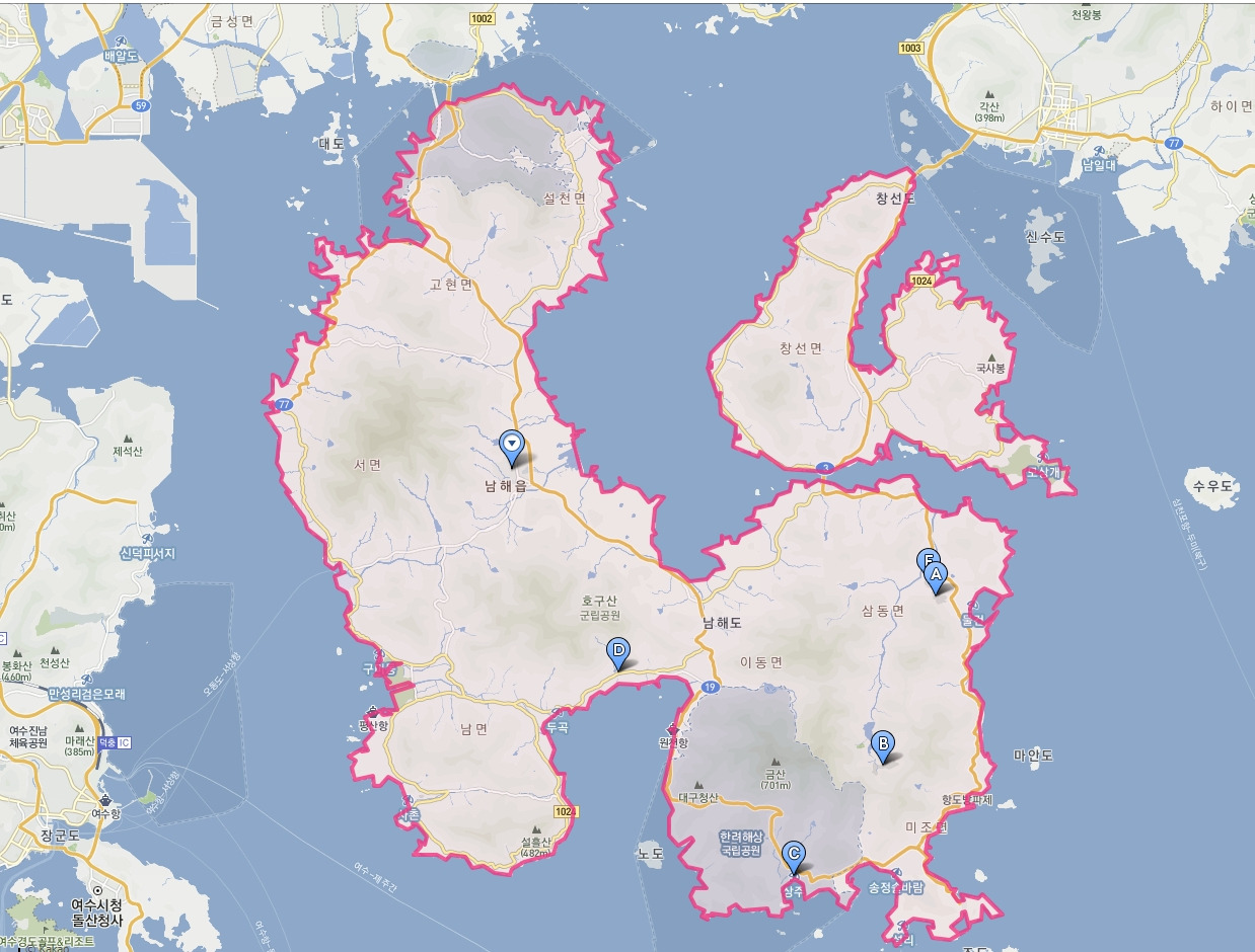 섬과 육지 간의 해협이 불과 1km도 안되기 때문에 가까운 섬처럼 느껴지지만 섬에 들어서서 길을 따라가다 보면 섬 내륙을 지나는 데만도 한 시간 이상 족히 걸립니다. 사람들이 즐겨 찾는 가천 다랭이마을이나 보리암 역시 남해대교를 기준으로 한 시간 이상 걸리는 곳들입니다. 그마만큼 섬이 크고 넓습니다.
