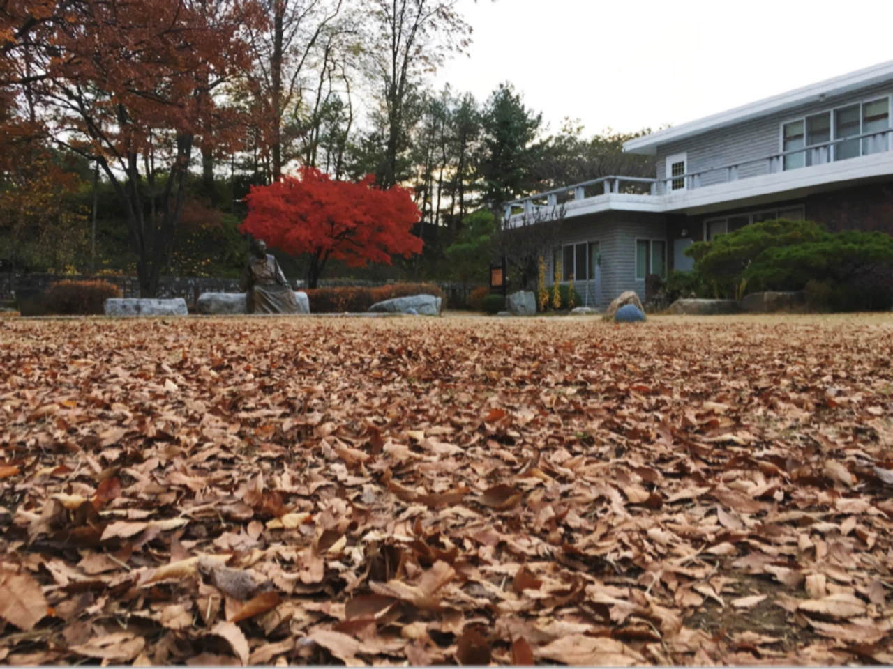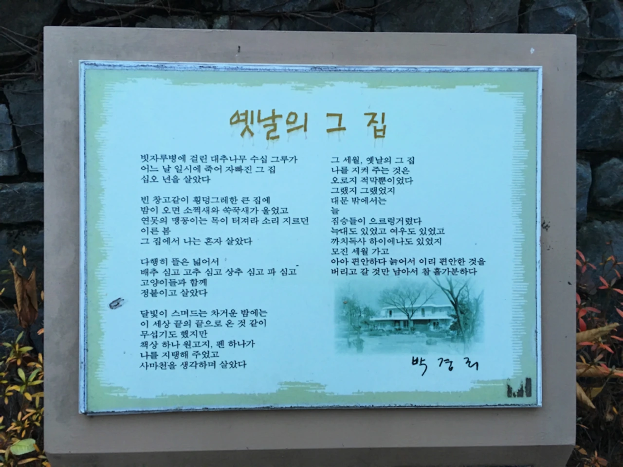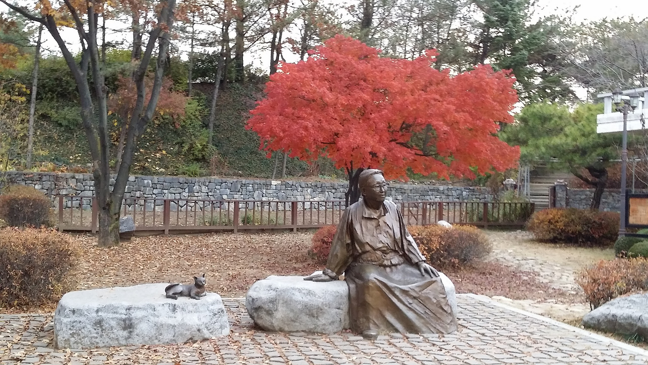 고양이 한 마리와 바위에 걸터앉아 물끄러미 빈 마당을 바라보고 있는 선생의 동상이 왠지 쓸쓸해 보인다.