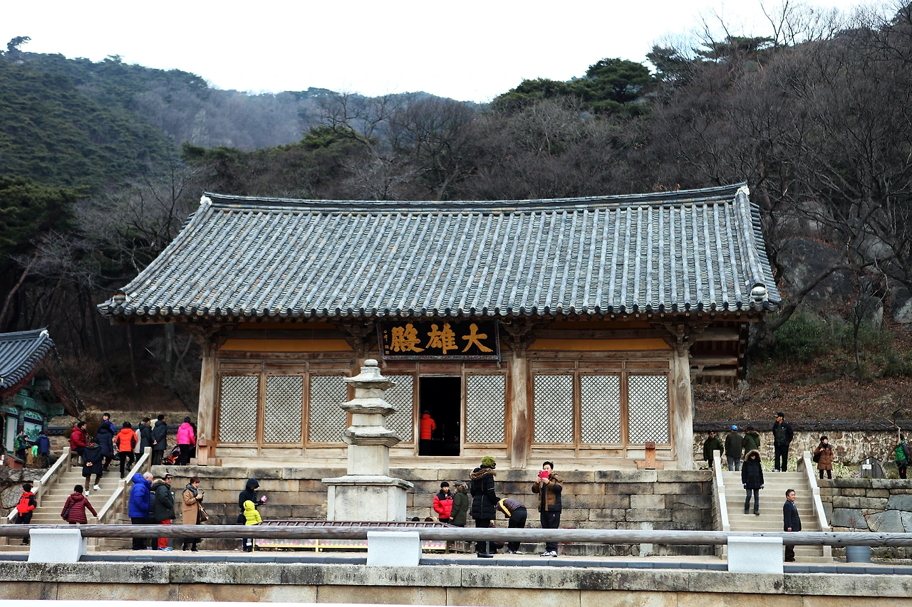 이런 날일 수록 조금이라도 컬러풀한 색이 있다면 가장 먼저 눈에 띄기 마련이다. 절집 오르는 일주문 초입부터 검은 바탕에 흰 글씨로 써 붙여진 편액들과 주련들이 먼저 눈길을 잡는다. 금강문, 사천왕문 등의 편액들을 쫒아 오르다 보면 이내 힘차고 당당한 필체의 대웅전 현판에 이른다.