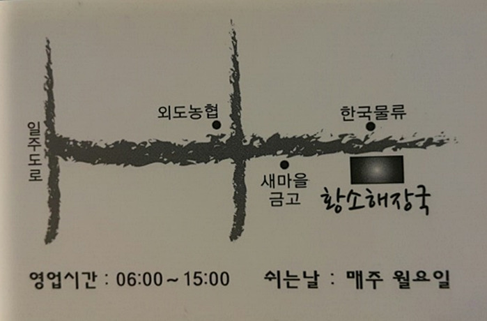 제주 서쪽 지역에 외도라는 곳이 있습니다. 가수 이효리가 사는 동네로 더 알려진 애월 가기 전 바닷가를 끼고 있는 작은 신도시입니다. 이곳에 맑은 해장국과 맑은 내장탕을 잘 끓이는 식당이 있습니다. 황소 해장국이 바로 그 집입니다.