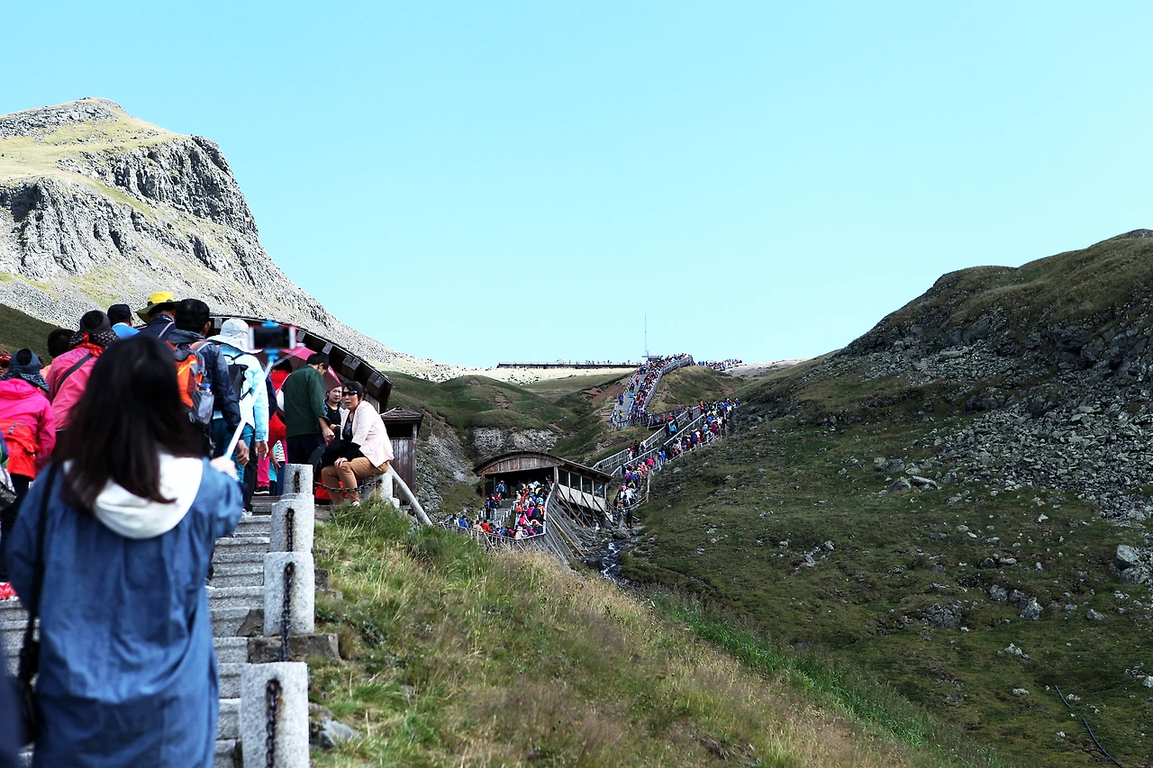서파코스를 오르기 위해서는 백두산의 관문 마을인 이도백하(二道白河)에서 한 시간 여 차량으로 이동을 해야 합니다. 그리고 울창한 산림지대를 셔틀버스로 50여 분 더 가야 하고, 주차장부터는 1,442개의 계단을 올라서야 비로소 천지를 만나게 됩니다. 가파른 계단이 끊임없이 이어지지만 오르는 길 좌우로 펼쳐진 초원지대에는 다양한 고산지대 식물들이 식생하고 있어 이들과 눈맞춤 하며 오르다 보면 힘듦이 사라지고 이내 정상이 나타납니다. 정상에 이르면 북한과 경계를 이루는 37호 경계비가 있고, 그 너머로 북파에서 보이는 천지와는 달리 유순한 천지가 한눈에 들어옵니다.