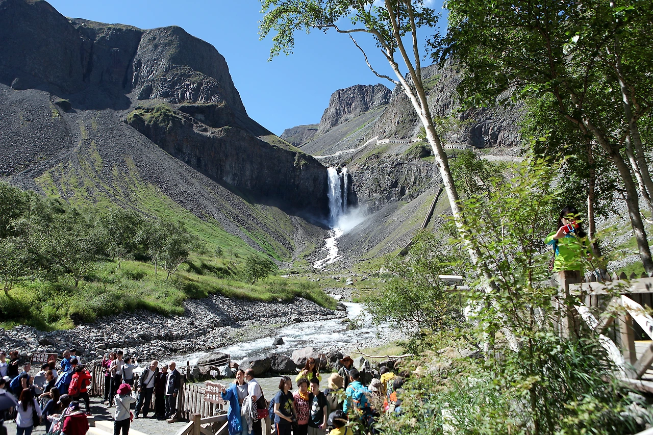 천지의 달문을 빠져나온 물이 완만한 경사를 따라 흐르다 수직으로 낙하하는 곳을 만나게 됩니다. 이곳이 바로 백두산에서 가장 웅장하고 경관이 압도적인 장백폭포입니다. 용이 날아가는 모습과 같다 하여 비룡폭포로도 불리는 이 곳은 수직 낙차의 길이가 68m에 이르고 떨어지는 물소리가 멀리에서도 우렁차게 들립니다. 폭포를 향해 오르는 초입에는 노천온천이 있습니다. 이곳에서는 온천물과 함께 유황성분 가득한 기포가 쉴 새 없이 뿜어져 나오고 있습니다. 장백폭포의 물은 이도백하(二道白河)를 지나 쑹화강(松花江)으로 이어집니다.
