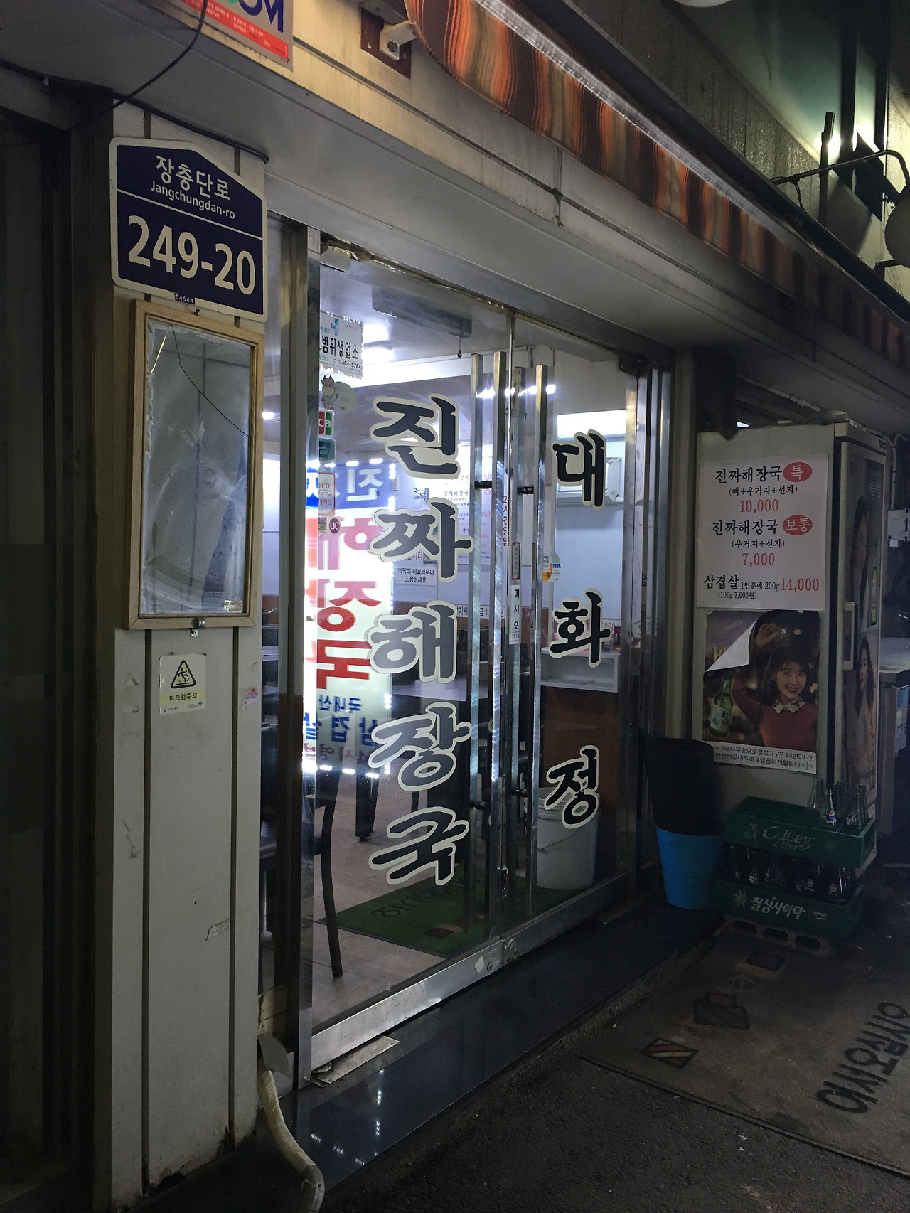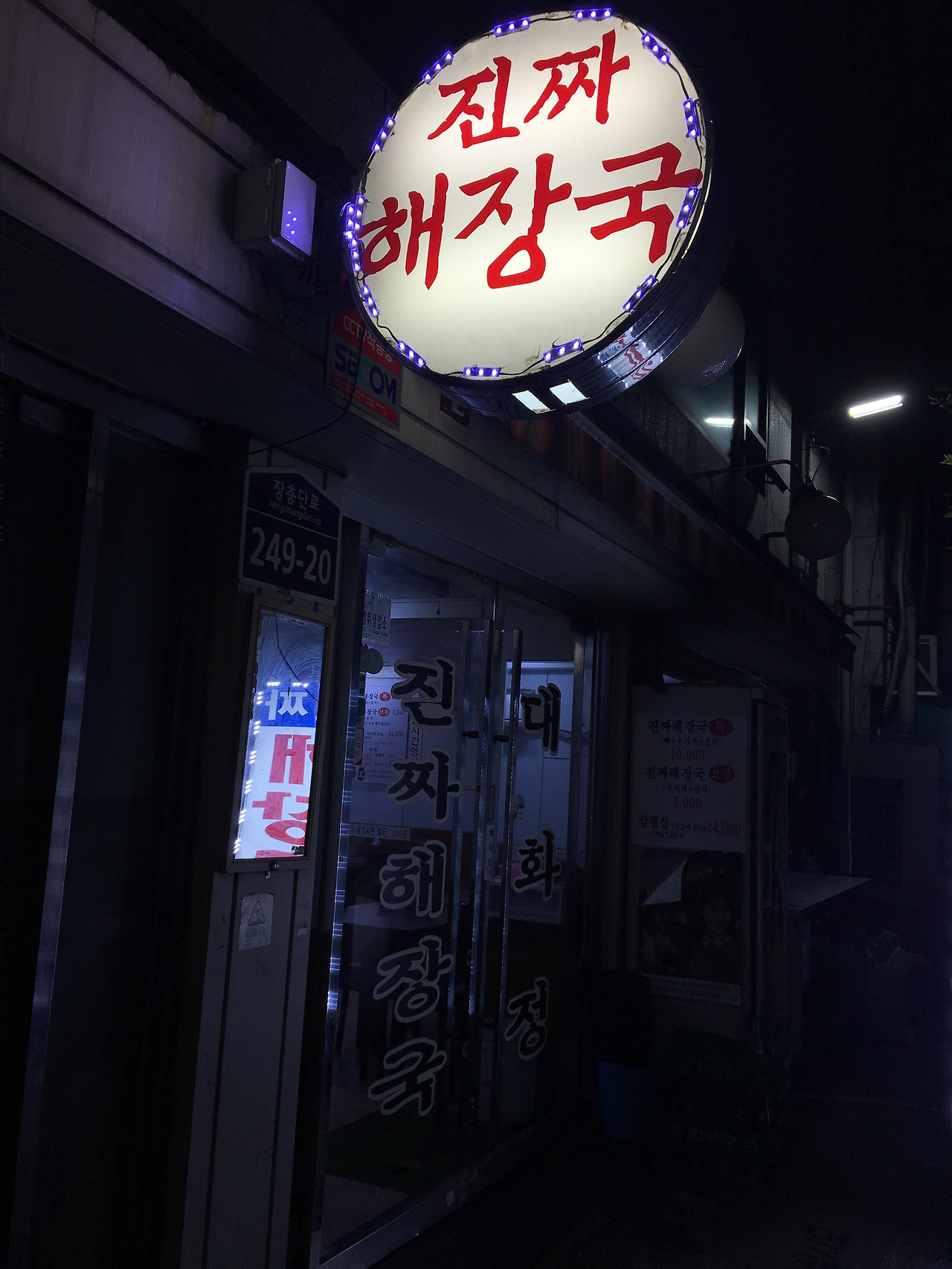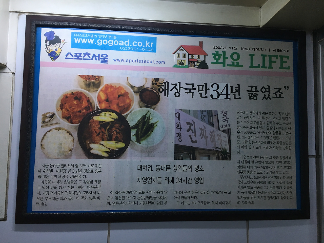 호텔 로비를 벗어나 거리로 일단 나왔다. 동대문 밤거리는 여전히 낮보다 더 휘황찬란하였고 이렇게 된 김에 허기진 배와 소주한잔 곁들여 남은 시간을 보내려는 요량으로 불 켜진 해장국집으로 들어섰다. 들어간 곳은 ‘대화정’이라는 30년 넘은 해장국 노포 식당이었다. 대화정이라는 상호보다 진짜 해장국이라는 이름으로 동대문 상인들에게 널리 알려진 곳이라는 사실도 알게되었다.
