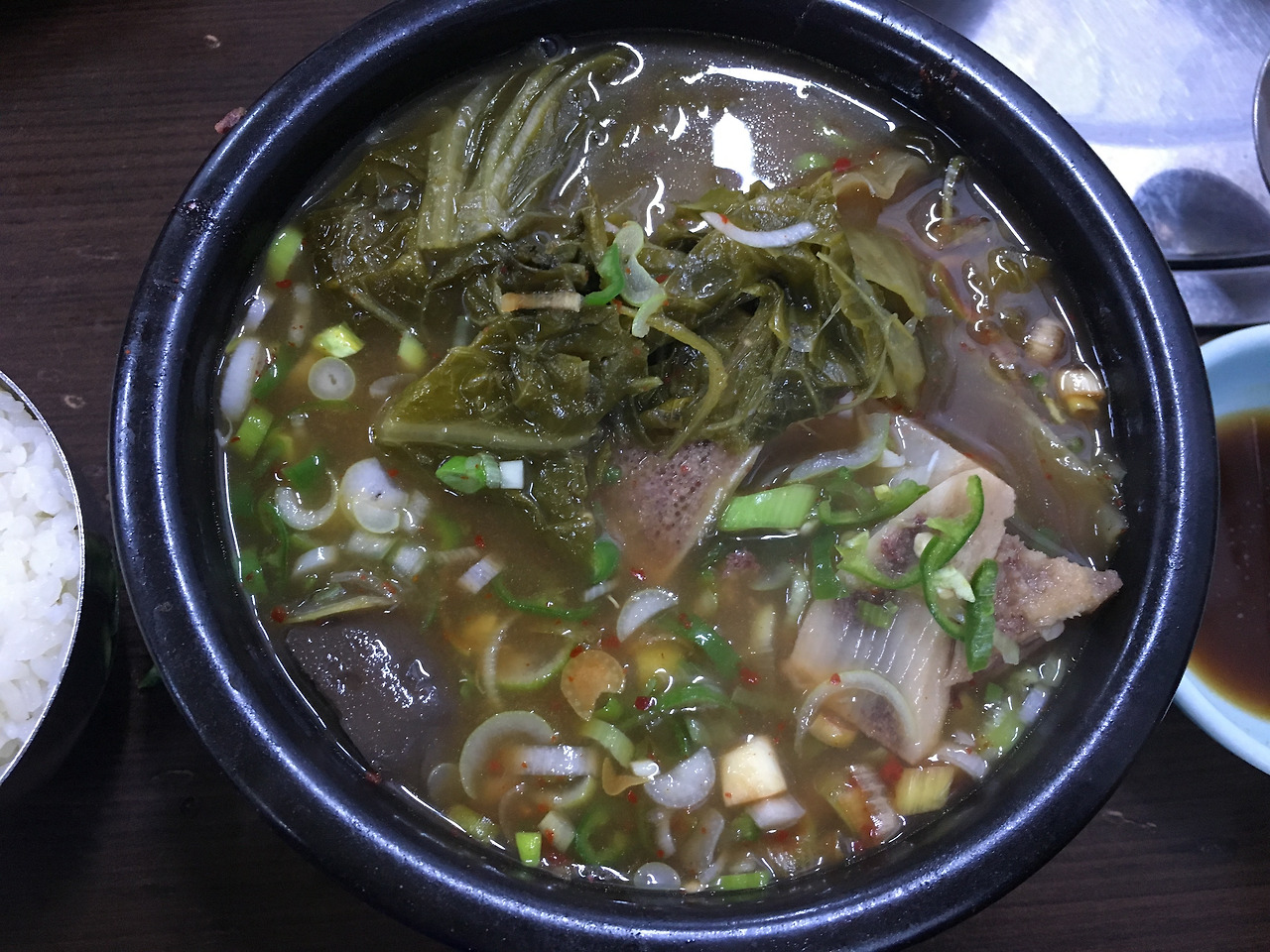 이 집 해장국을 보니 큼지막한 소뼈와 선지, 그리고 우거지가 듬뿍 들어간 서울식 해장국이었다. 서울식 해장국의 특징은 맵거나 짜지 않고 자극적이지 않다는 점이다. 오랜 시간 끓여낸 사골국물 육수에 된장을 풀어 간을 맞추고 우거지를 듬뿍 넣어 달짝지근한 맛을 내게 한다. 거기에 선지를 넣으면 서울식 해장국이 된다.