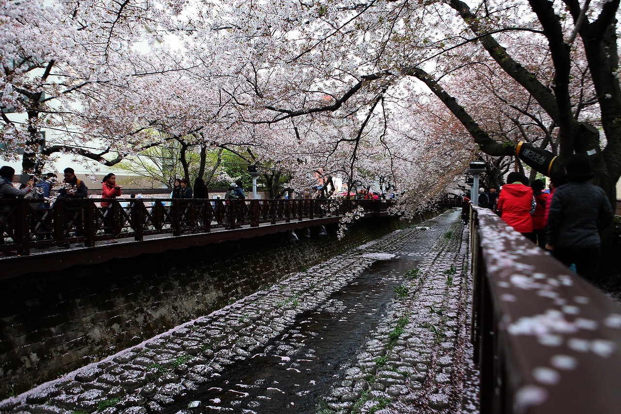 여좌천 벚꽃나무는 수령이 많습니다. 그 늙은 벚꽃나무 그늘 아래로는 젊은 청춘들이 넘쳐납니다. 잿빛 개울을 따라 늘어진 벚꽃 가지에는 솜사탕처럼 꽃이 열리고 바람이라도 하늘거리면 떨어지는 모습조차 눈부시게 아름다운 풍경을 자아냅니다. 그래서 여좌천은 진해 벚꽃의 1번지입니다. 비가 내리고 바람도 간간히 불어댑니다. 꽃잎은 하릴없이 떨어지고, 떨어진 꽃잎은 여좌천 물길을 따라 제 멋대로 떠내려갑니다. 속절없다는 표현이 맞을까요? 물끄러미 떠내려가는 꽃잎을 보는 마음이 괜스레 횅해져 옵니다.