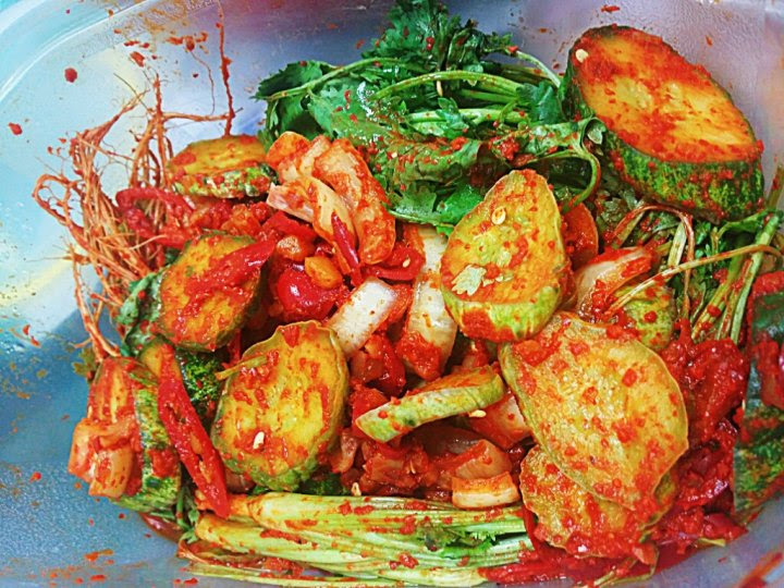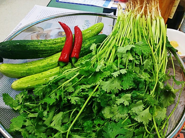 나만의 방식으로 고수겉절이를 담근다. 비법이라고 할 것도 없다. 준비해놓은 고수 나물과 오이, 그리고 홍고추, 양파에다가 고추 가루와 굴소스 약간, 다진 마늘에 매실 청을 넣어 골고루 버무린다. 천일염을 조금씩 넣어가며 간을 맞춘다. 마무리로 깨소금 살짝 뿌려주면 보기에도 좋고 더 먹음직스럽다.