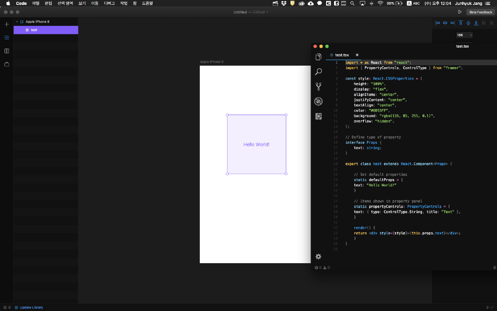 그렇다면 기존에 있던 코드를 작성하는 창은 어디로 사라졌을까요? 안타깝지만 Framer X는 코드창을 따로 제공하지 않습니다.