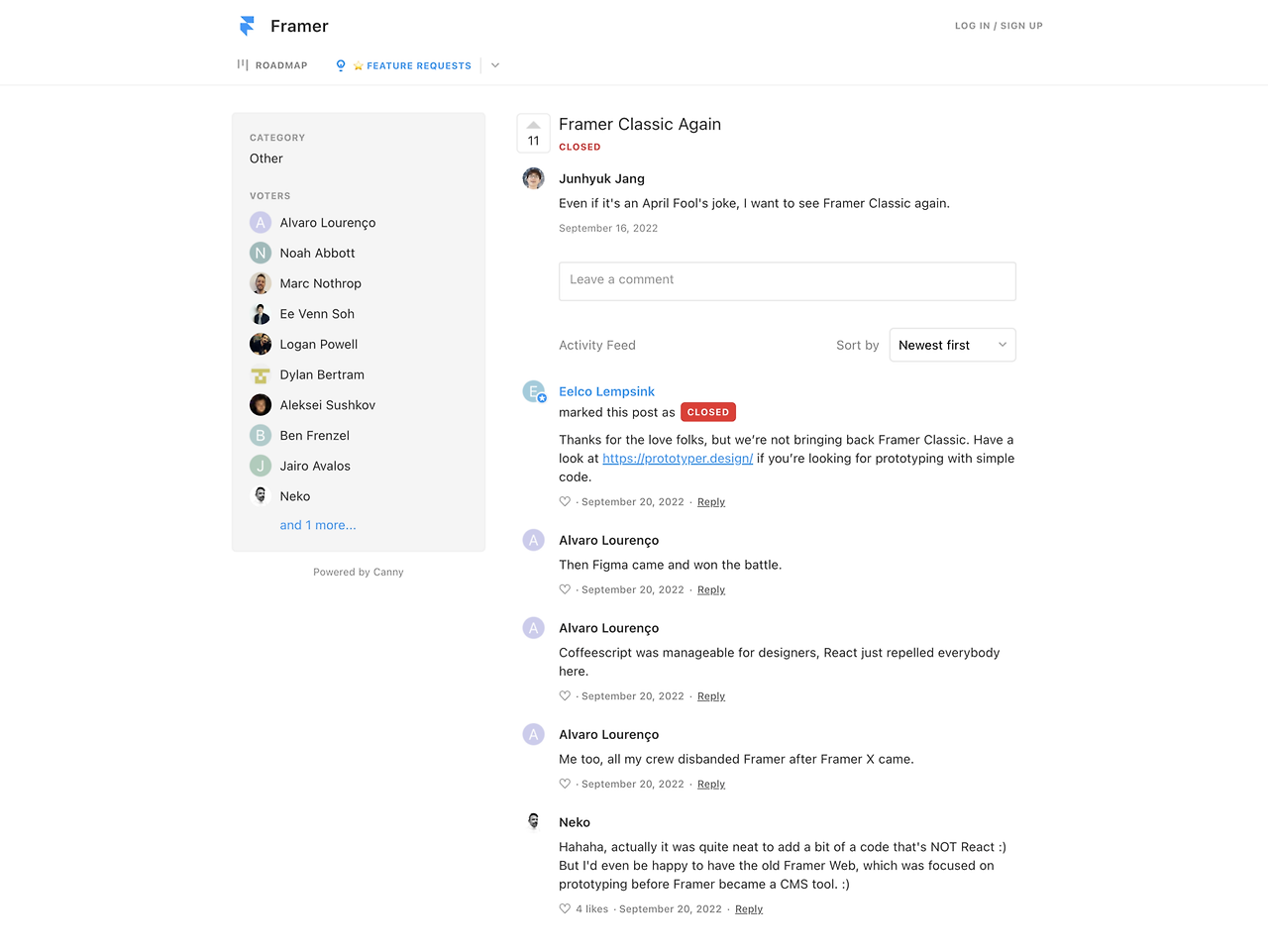 혹시나 나와 같은 생각을 하는 사람들이 조용히 숨어있는 것은 아닐까 하고, Framer의 기능 요청 게시판에 글을 올려보기도 했다. 몇 사람들의 공감을 받긴 했지만, 냉정한 답변과 함께 나의 글은 ‘CLOSED’ 처리 되었다.