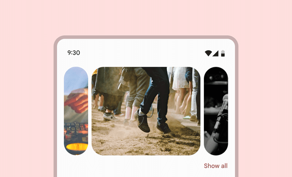 두번째. 어포던스를 강화할 수 있다. 기존 carousel의 경우 화면 크기에 따라 아이템의 길이가 화면 안에서 딱 맞게 떨어지는 경우가 있는데, 이 때 유저는 준비된 아이템이 더 있다는 사실을 눈치채기 어려워 추가적인 탐색을 하지 않을 수 있다. 하지만 M3의 carousel은 아이템의 크기와 이미지 크롭이 일정한 패턴으로 변화하는 상태를 처음부터 보여주고 있기 때문에 상대적으로 추가적인 아이템의 존재를 예상하기 쉽고, 탐색을 유도하기 용이하다.