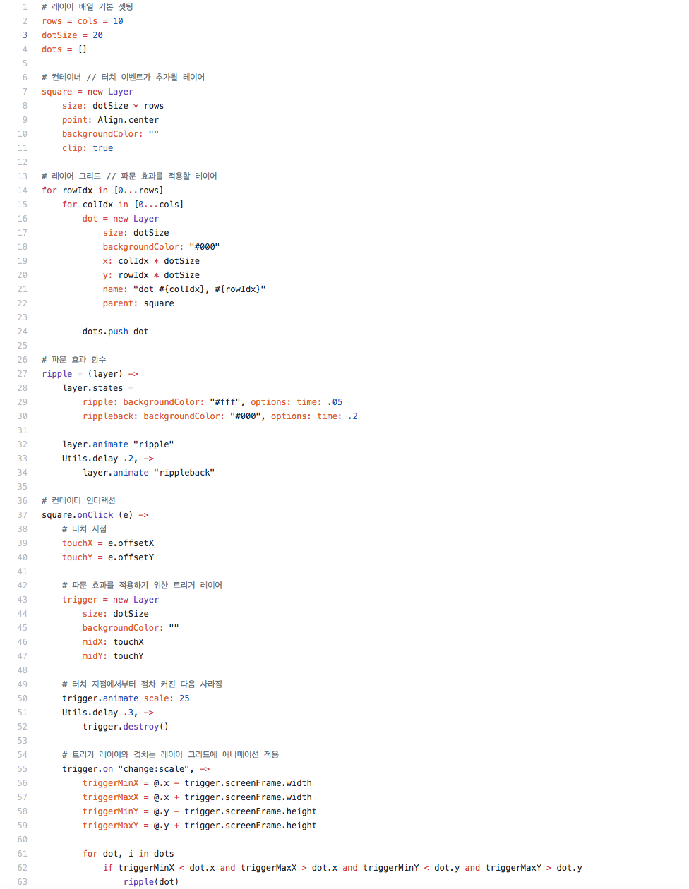 우선 여러 개의 작은 레이어들을 그리드로 펼쳐놓고, 터치 지점에서부터 점차 커지는 레이어를 만들어, 레이어가 커지면서 겹쳐지는 그리드에 애니메이션 효과를 차례로 재생하면 비슷한 느낌을 줄 수 있을 것 같았다.