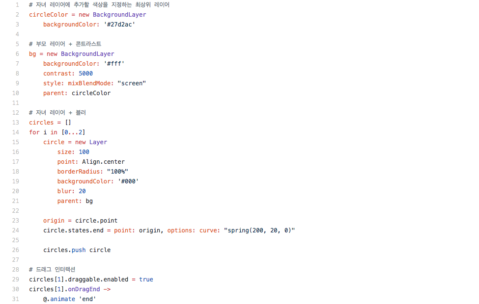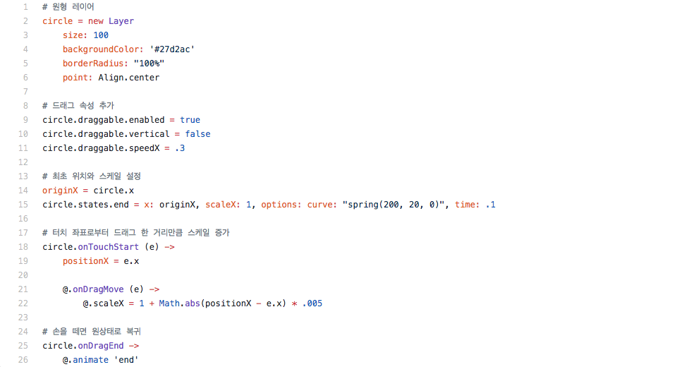 당기는 방향으로 살짝 늘어나고, 손을 놓으면 다시 튕기며 줄어드는 움직임은 Framer를 통해 20줄 내외의 코드로 비교적 간단하게 구현할 수 있었다.