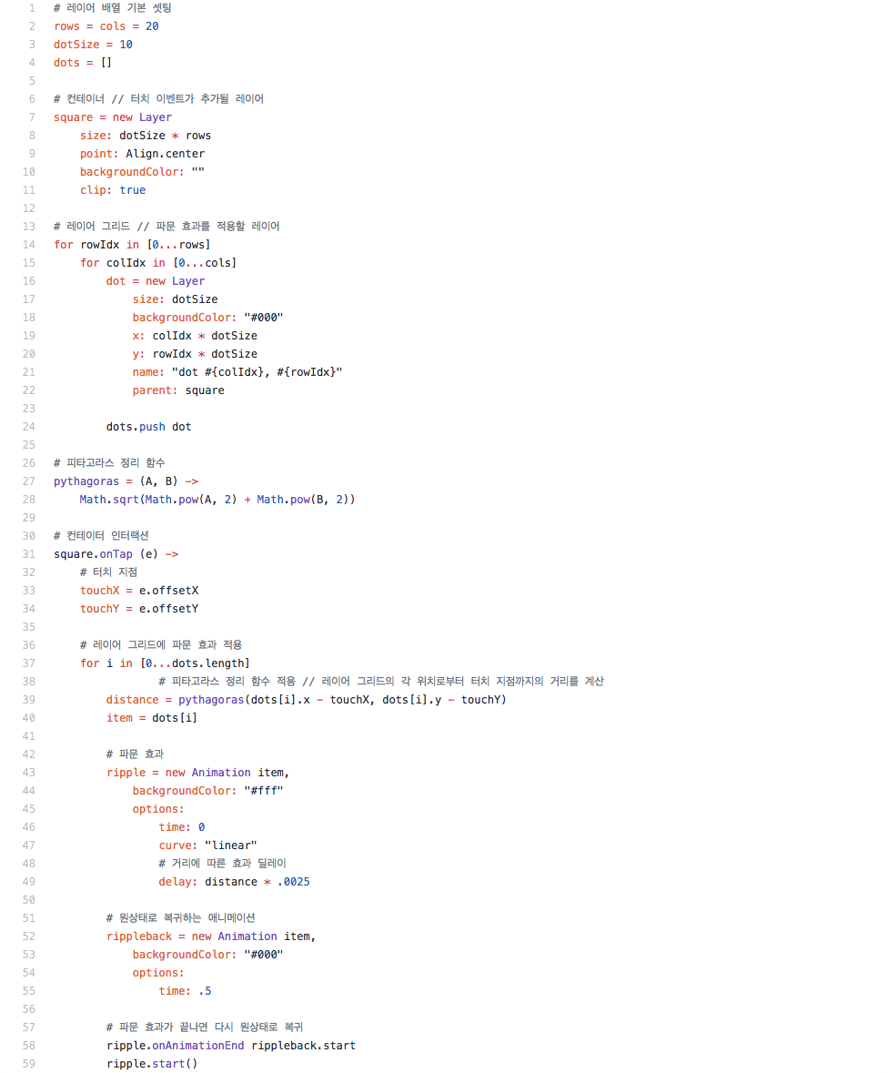 만약 거리만 계산할 수 있다면, 그 거리만큼 애니메이션에 딜레이를 줘서, 터치 지점에서 같은 거리만큼 떨어져 있는 레이어들에 균일하게 효과를 적용할 수 있을 것이라는 가정이었다.
