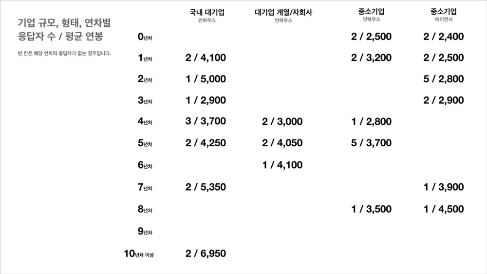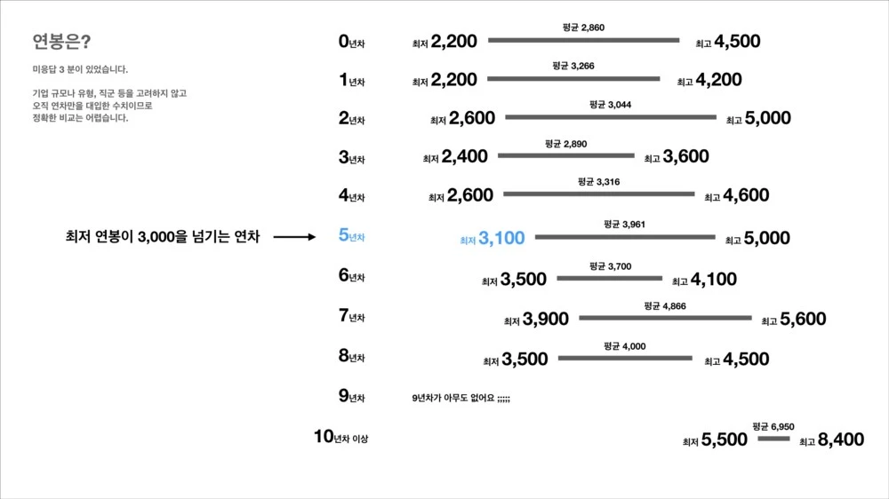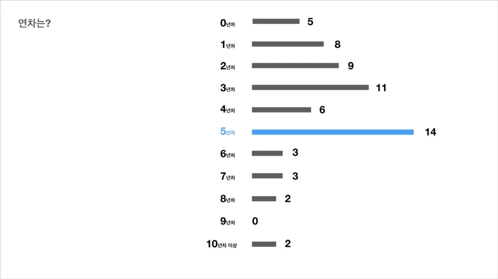 보통 3의 배수에 해당하는 연차에서 변곡점이 찾아온다고 했다. 그래서 3년차가 되었을 때, 이직을 하거나 아예 업계를 떠나는 경우를 종종 보았다. 4년차에서 숫자가 줄어드는 것은 그런 탓이었을까? (5년차가 가장 많다는 점에서 꼭 그런 것 같지는 않지만…)