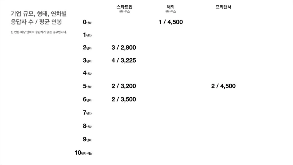 첫 질문에서 해외로 응답했던 1명은 이제 막 시작하는 0년차인데 연봉이 4,500만원 이었다. 국내보다 훨씬 나은 대우를 받고 있는 것으로 보이지만, 글쎄 과연 그럴까? 그 나라의 물가수준이 어느 정도인지에 따라서 국내와 큰 차이가 없을 지도 모르겠다는 생각이 든다.