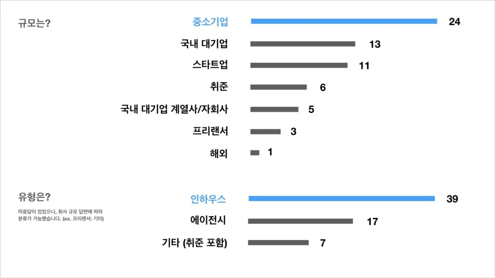 역시 예상했던대로 중소기업이 많았으나, 대기업에서 근무하는 분도 상당수 있었다. 그리고 인하우스에서 일하는 디자이너의 숫자가 에이전시에서 일하는 디자이너의 2배 정도였다.