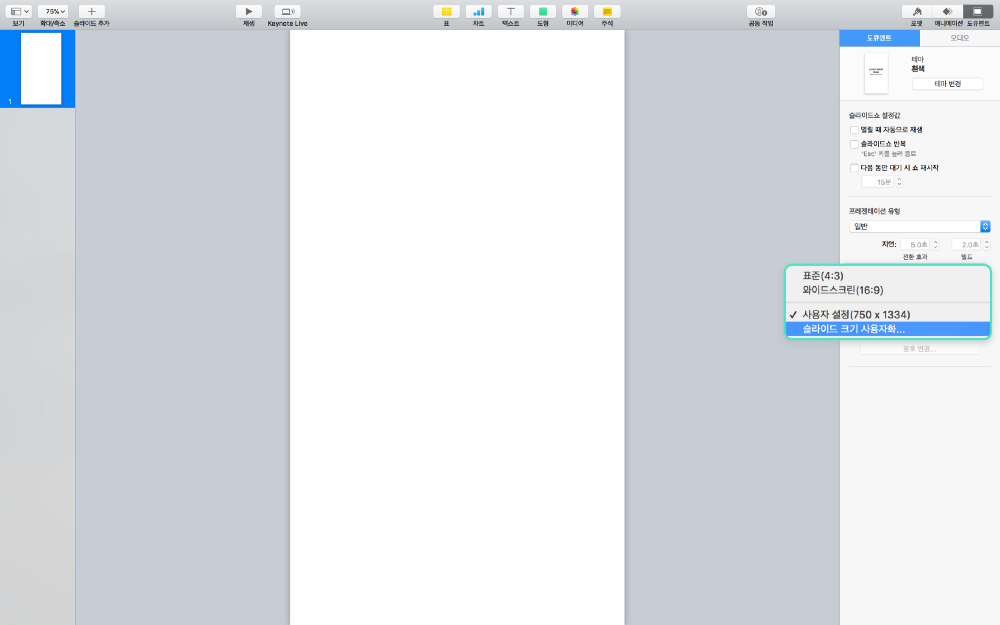우선 새 파일을 하나 열고, 슬라이드 크기를 원하는 디바이스의 해상도로 설정합니다. 저는 750x1334로 만들어 보겠습니다.