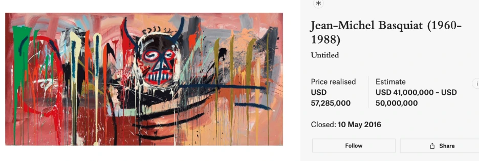 한편, 지난 2021년 바스키아는 놀랄만한 가격 상승으로 글로벌 옥션 역사를 새로 쓰고 있어 이제 그의 앞 유일한 존재는 피카소뿐이다. 이런 추세로 볼 때 위 작품은 추정 가격보다는 높게 판매될 가능성이 크다. 필립스 측에서도 이미 "work is backed by a third party guarantee" 즉, "비딩이 없어도 추정가에 구매자 확보"라고 발표하였다.