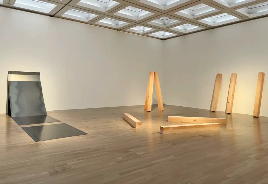 이우환의 모노하를 잘 보여주는 다섯 장의 철판과 나무 기둥들로 꾸며진 설치작품 [관계항 I], [관계항 Ⅱ]