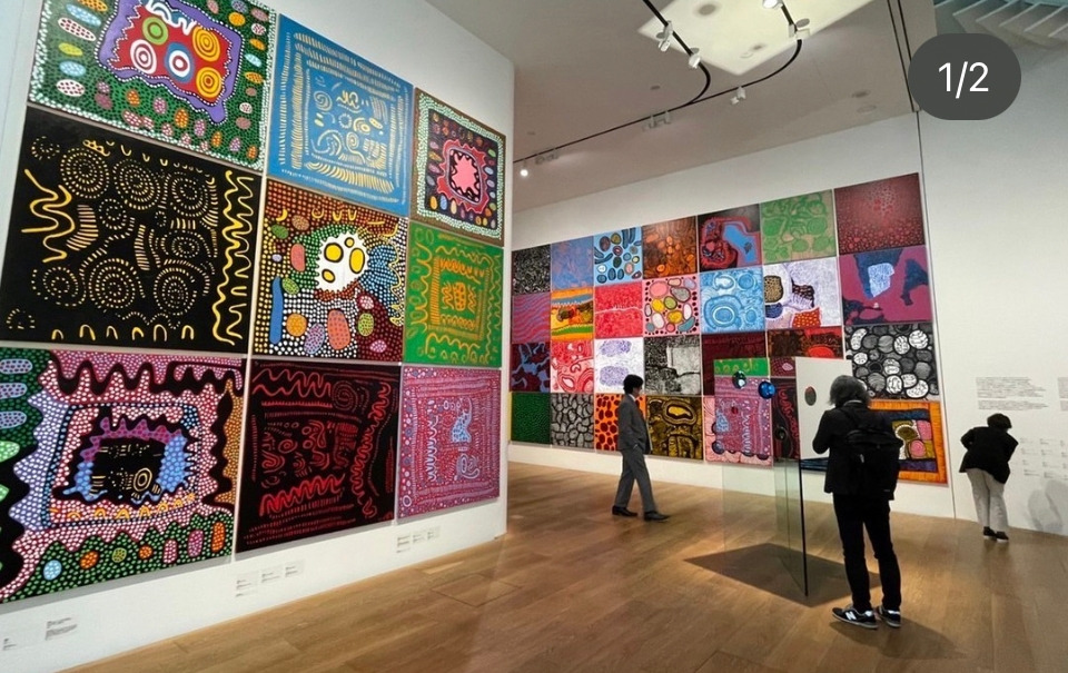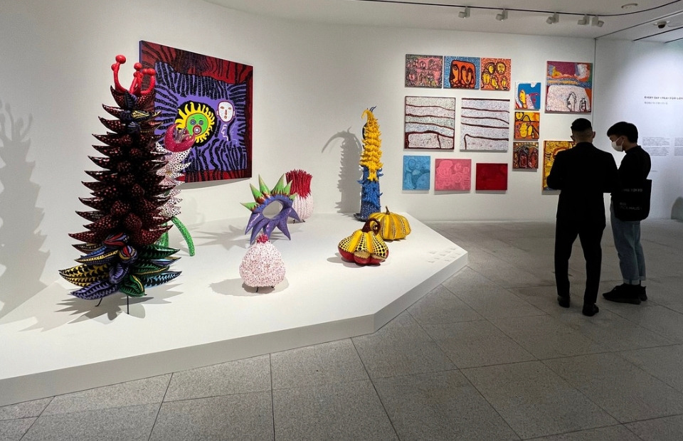 사진 촬영이 엄격히 제한되는 2층과 3층이 미술관의 메인 전시실이라고 할 수 있는데 2층에는 이번 전시의 대표 작품인 쿠사마 야요이의 최신작 시리즈를 만날 수 있다. 2022년부터 쿠사마 야요이의 회화 작품의 뒷면에 "毎日愛について祈っている"라는 문구가 자주 등장하는데 "나는 매일 사랑을 위해 기도한다"라는 이 문구는 새로운 회화 작품의 작품명이 되기도 하고 쿠사마 야요이가 쓰고 있는 시들의 제목이 되기로 한다.