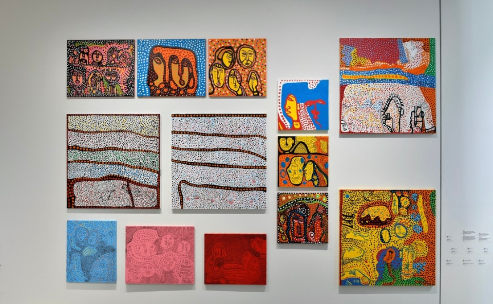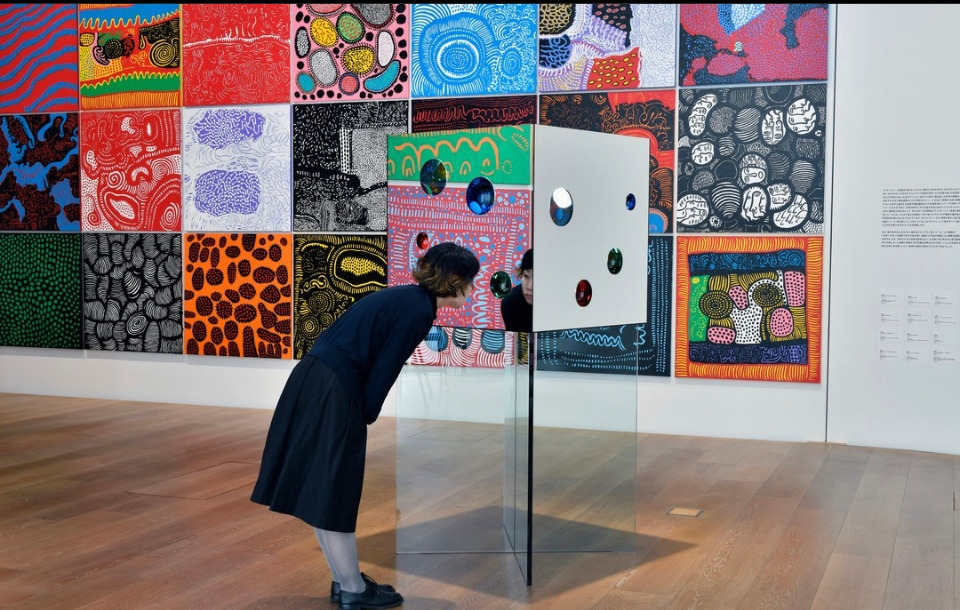 회화 외에 1점의 설치 작품도 전시 중인데 "The Universe as Seen from the Stairway to Heaven"이라는 작품명의 '들여다보는 거울 작품'으로 기존 작품과는 달리 여러 개의 구멍을 통해 제각각 다른 풍경이 펼쳐지는 게 흥미롭다. 회화뿐 아니라 이런 간단한 원리의 설치 작품을 통해 신비로움과 아름다움을 함께 고안하고 연출해 내는 고령의 예술가 쿠사마 야요이의 대단함이 새삼 느껴지는 작품이다.