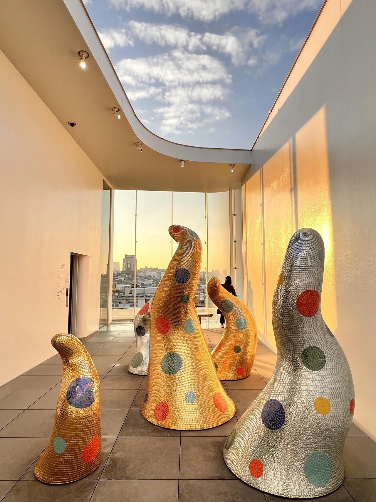 쿠사마 재단 (Yayoi Kusama Foundation)에서 운영하는 쿠사마 야요이 미술관은 총 5개 층의 아담한 건물로 각층별로 전시 테마가 구분된다. 관람 동선은 1층부터 5층까지 다소 가파른 계단을 올라 각 전시실을 둘러본 후 5층의 루프탑에서 조형물을 관람하고 엘리베이터를 이용해 1층으로 내려오게 디자인되어 있다. 100% 사전 예약을 통하여 관람객을 맞이하는 미술관은 예약 완료 시 발행되는 QR 코드를 미술관 입구에서 확인받은 후 입장이 가능하다. 이번 기획전 "나는 사랑을 위해 매일 기도한다"를 관람 동선을 따라 옮겨본다.