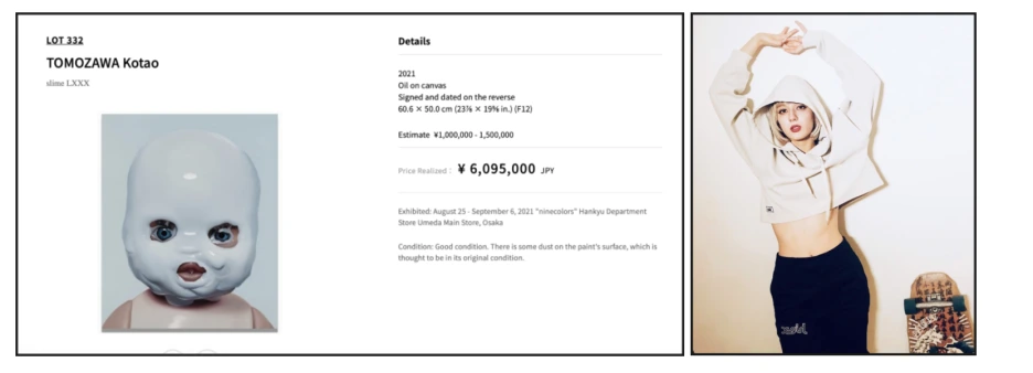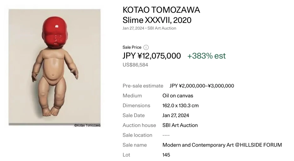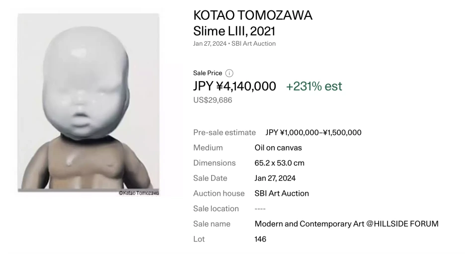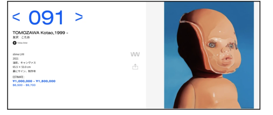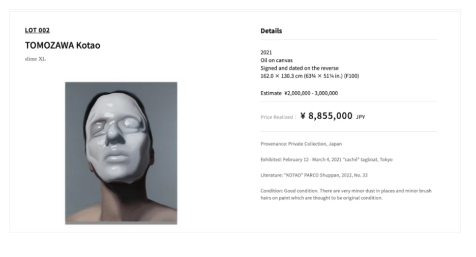 대학 시절부터 각종 수상을 하며 주목을 받아오던 토모자와 코타오는 대학원생 신분으로 이미 웨이팅 리스트를 어마어마하게 거느린 이머징 스타가 되었는데 학생 신분을 벗어난 그녀의 작품 가격은 그녀의 인기를 잘 방영하고 있다. 20대 나이에 이미 1억 원대 작품 가격을 형성하고 있으며 전시회는 열리기 전 솔드아웃, 세컨더리 마켓은 말 그대로 박 터지는 경합이 펼쳐진다.