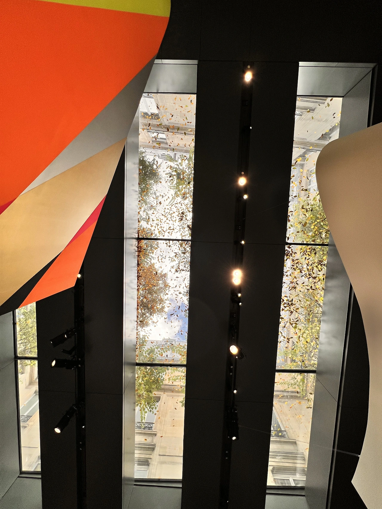 이런 과감한 디자인 덕분에 1층의 중앙 전시실에서 고개를 젖혀 천정을 바라보면 미술관의 화이트 큐브가 아닌 낙엽이 쌓인 파리의 가을 하늘이 바라보인다. 그리고 인도와 맞닿은 외부 벽면 일부에 대형 베이 윈도를 그대로 두어 미술관의 내부와 외부를 시각적으로 연결했다.