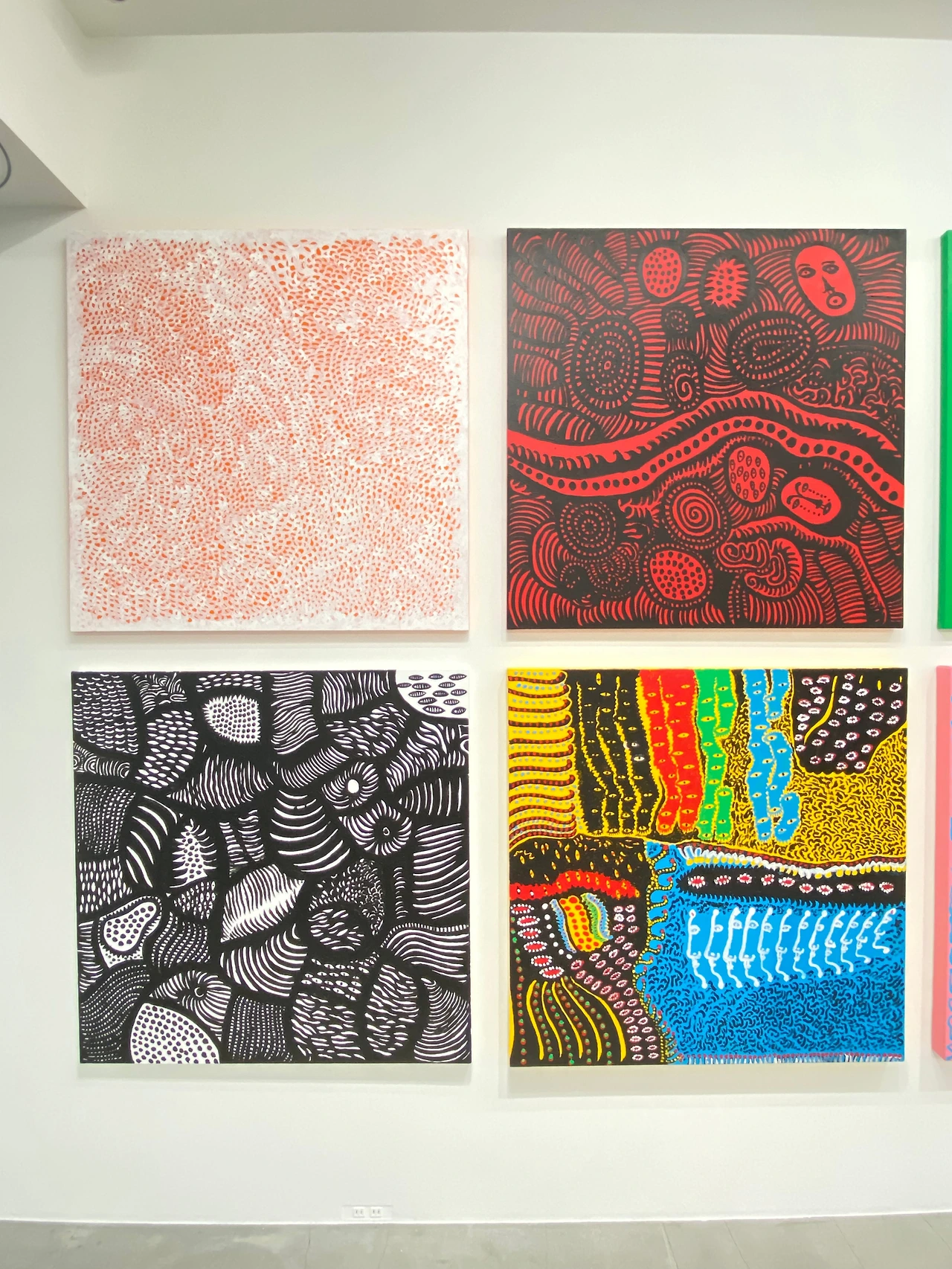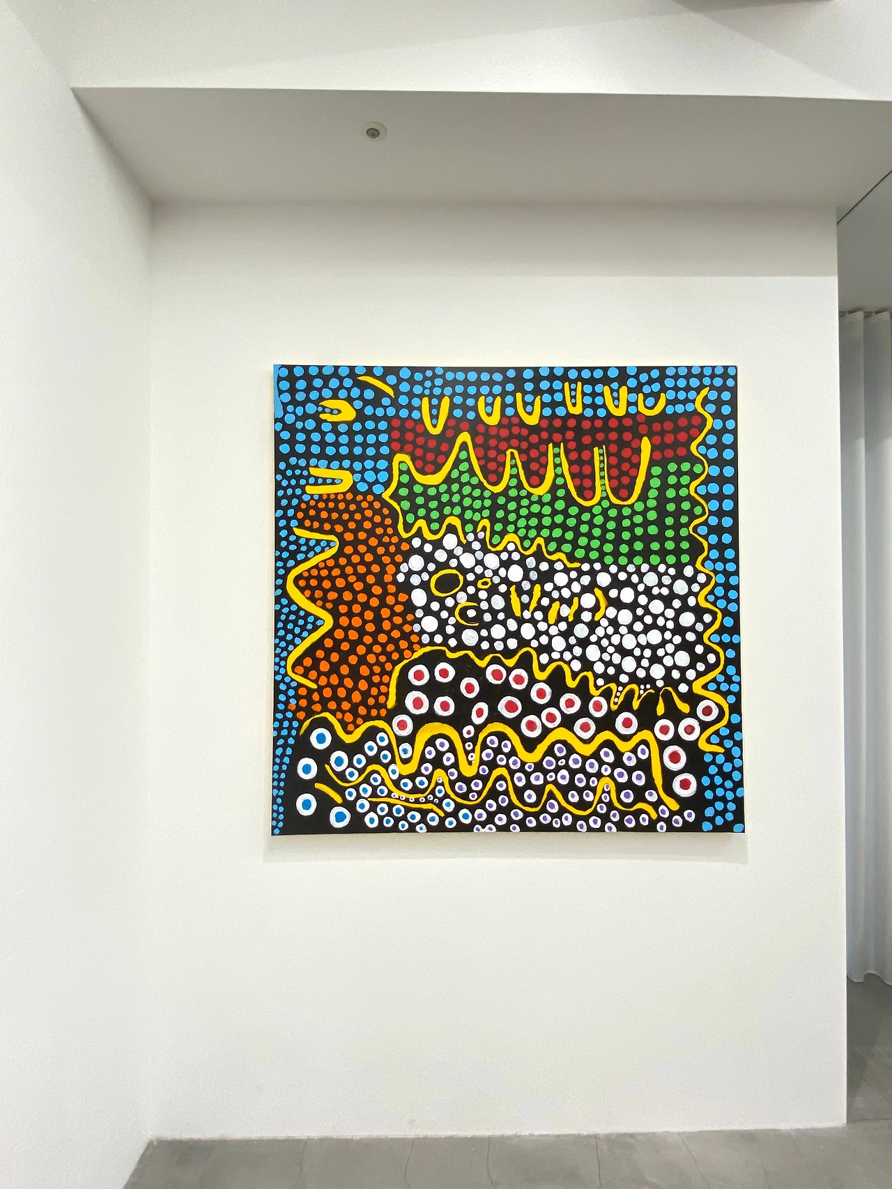 형형색색의 찬란한 빛을 입은 화사한 이번 전시 작품들의 테마는 아이러니하게도 '죽음'이다. 하지만 그녀가 그려낸 죽음들은 결코 어둡거나 무겁지 않다. 자신의 94년 생애를 더듬어보며 그렸다는 '나의 영원한 영혼, My Eternal Soul' 시리즈의 작품들 속에는 가장 유명한 호박과 인피니티를 비롯하여 쿠사마 야요이의 작품 속에 등장하는 여러 소재들이 들어가 있는데 간혹 해학스러운 표정의 인물들과 자신의 젊을 적 모습들도 등장하여 보는 내내 옅은 웃음을 자아내게 한다.