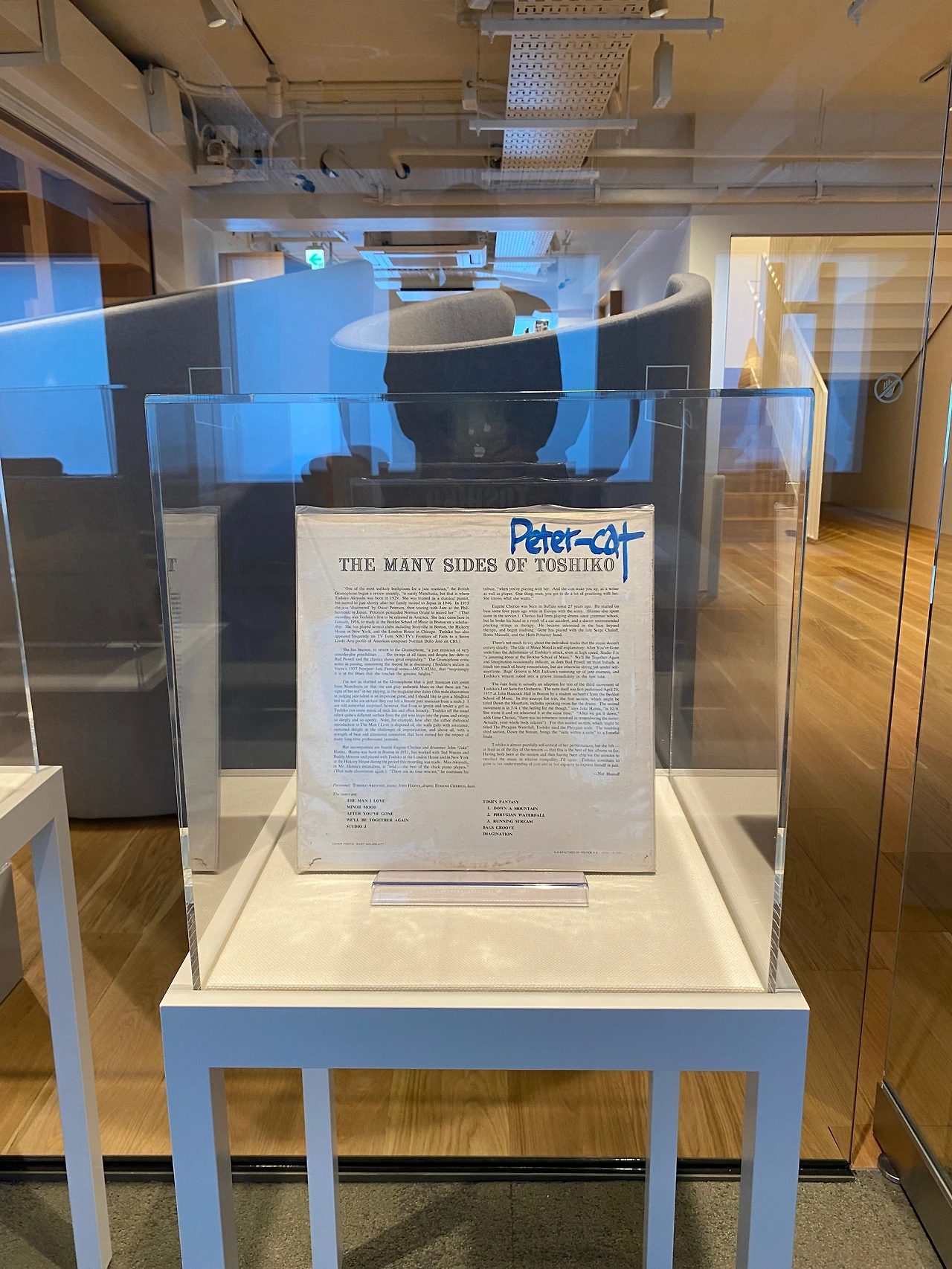 이층을 둘러본 후 호기심을 꾹 누르고 지나왔던 오디오 룸으로 향했다. 열린 강화 유리문 사이로 또 하나의 재즈가 흐른다. 하루키가 기증한 수만 장의 LP레코드판을 전시하며 실제 음반을 들을 수 있는 공간이 마련되어있는데 실제 음반은 이십여 장 정도만 전시되어있고 주기적으로 교체한다고 한다. 오디오실의 음향 장비 및 세팅은 오디오 평론가이며 하루키상의 오디오 조언가로 잘 알려진 오노데라 코지가 맡았다고 하는데 오디오 문맹인 내가 들어도 뭔가 있어 보이는 소리다. 내가 들어갔을 때에는 MILES DAVIS의 Round About Midnight 앨범이 소리를 내고 있었다.