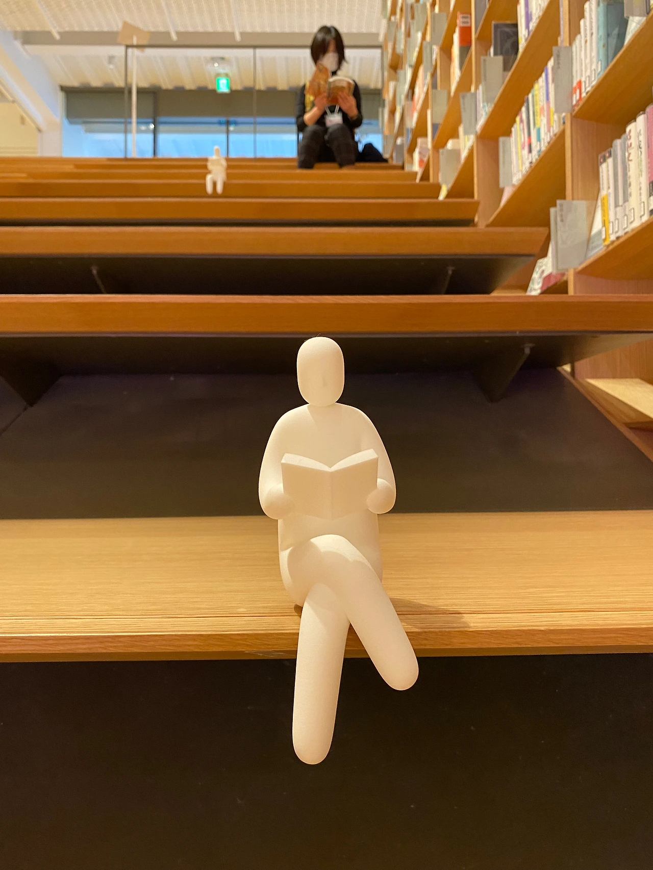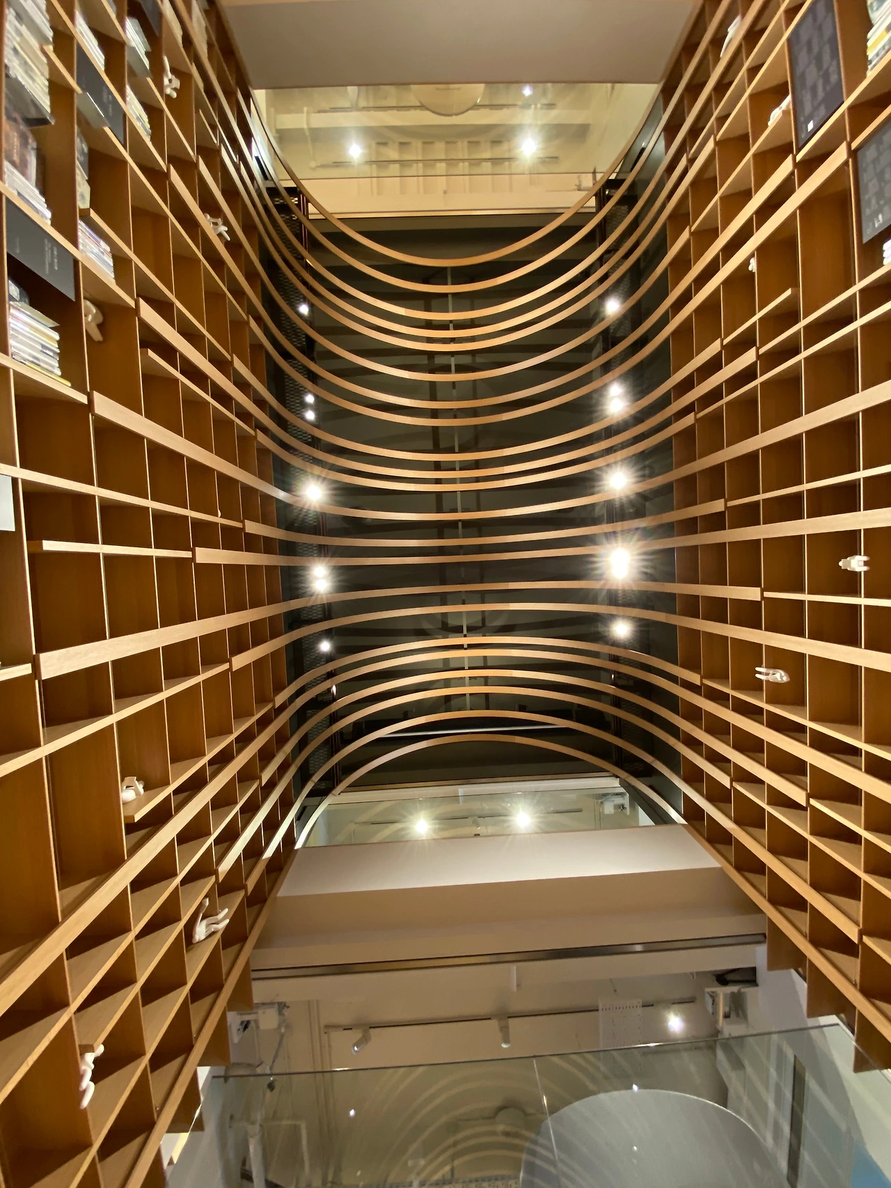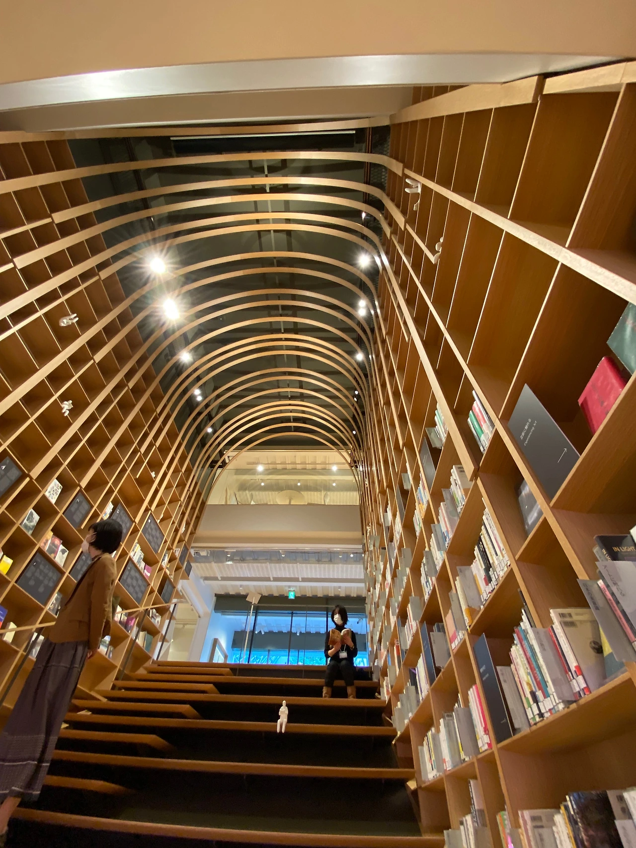 하루키 도서관의 입구이자 메인 공간인 이곳의 공식 명칭은 '계단 책장'이다. 명칭처럼 책장으로 둘러싸인 계단이 지상과 지하를 연결하는 곳으로, 시작 지점부터 커다란 책장이 좌우로 배치돼있고 책장의 맨 윗부분은 같은 원목 소재로 된 부드러운 아치형 곡선으로 이어져 끊어짐 없는 하나의 구조물을 이루고 있다. 한편 밝은 톤의 단단한 원목 바닥은 벤치를 겸한 계단의 역할을 하고 있어 이곳의 전체를 보면 나무로 둘러싸인 통로처럼 보이기도 하고 계단에 앉아 위를 올려다보면 나무로 된 새장에 들어와 있는 듯 느껴진다. 좌우의 책장에는 하루키의 책을 비롯하여 실제 꺼내어 볼 수 있는 책들이 촘촘히 놓여있어 앉은 채로 책을 읽거나 쉬어갈 수도 있다. 전체 길이가 그리 길지는 않지만 지상 2층까지 연결되는 높은 천정을 하고 있으며 경사가 꽤 가파러서 나무로 만들어진 언덕을 올라가는 느낌이다.