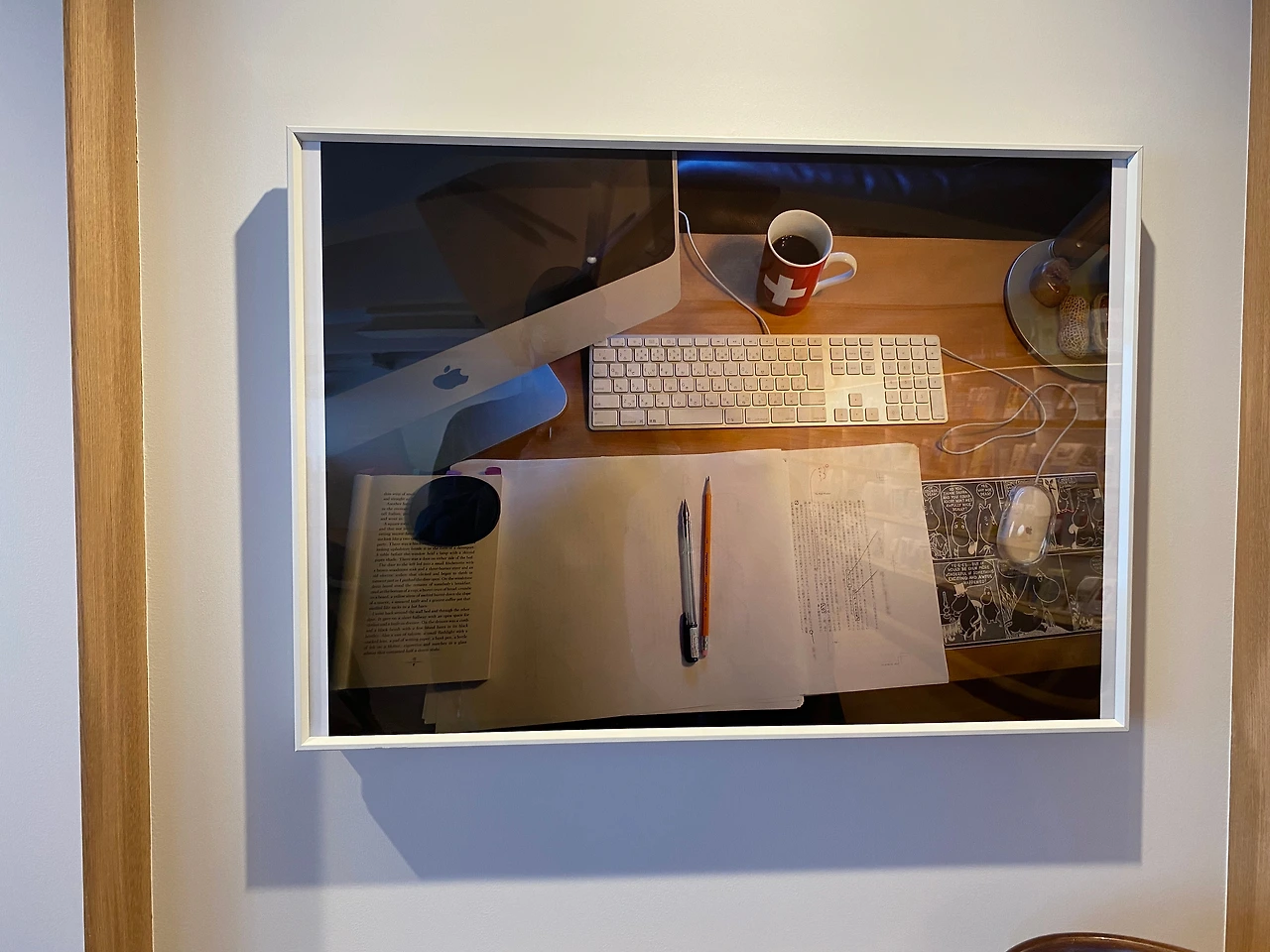 대 스타가 되고 나서도 한 번도 공개되지 않아 그의 후속작만큼 궁금증을 자아내던 무라카미 하루키의 서재가 재현되었다. 좁은 폭의 널찍한 직사각 원목 책상에 애플사의 데스크톱이 올려있고 책상 앞쪽에는 심플한 2인용 테이블과 1인용 의자 둘 그리고 3인용 의자 한 개가 놓여있다. 책상이 조금 높아서 무슨 접수 데스크 같아 보이기도 했는데 의자 깊숙이 들어앉아 약간의 인상을 쓴 채 애플 키보드를 두드리는 하루키를 잠시 상상해본다.