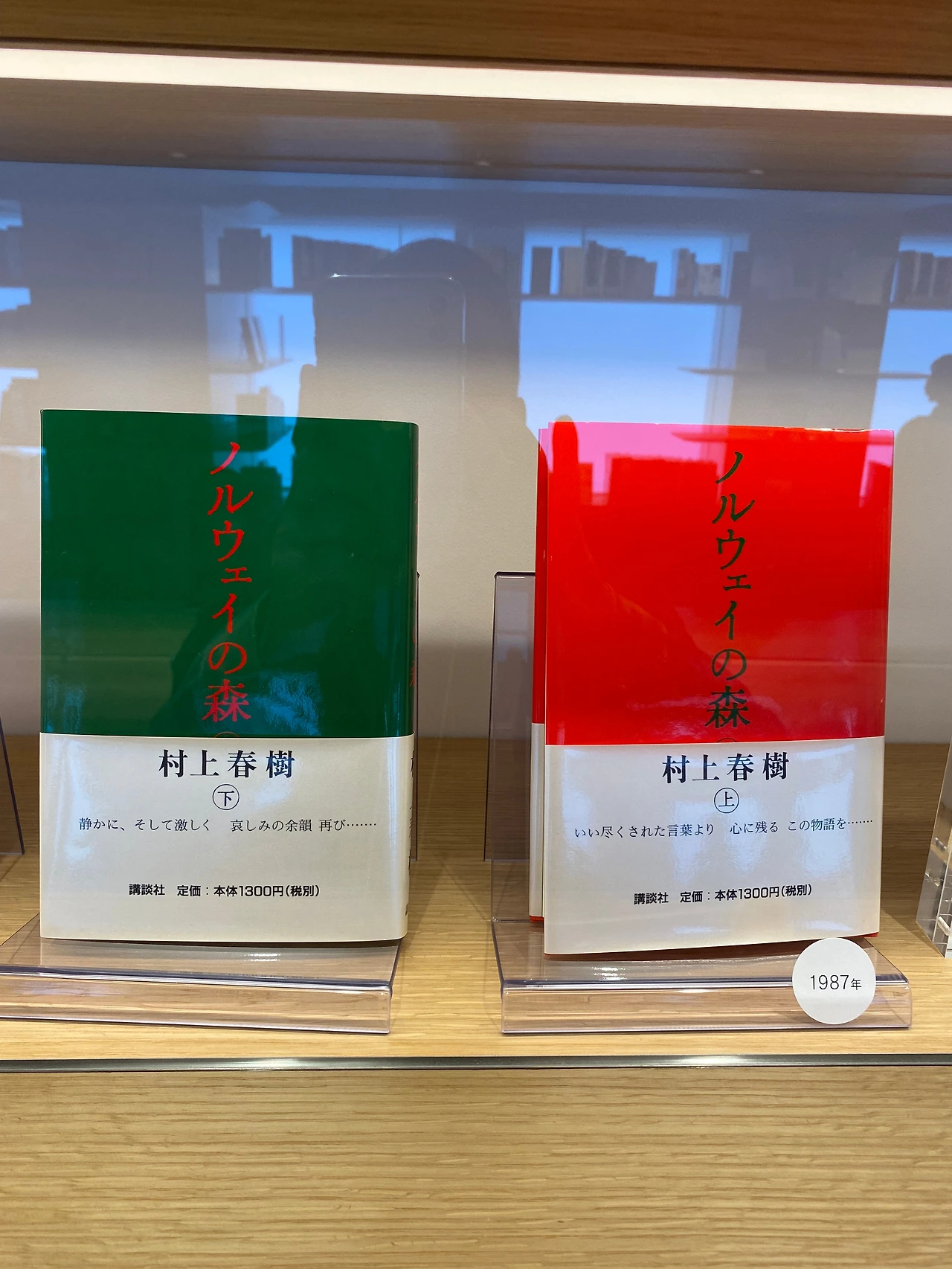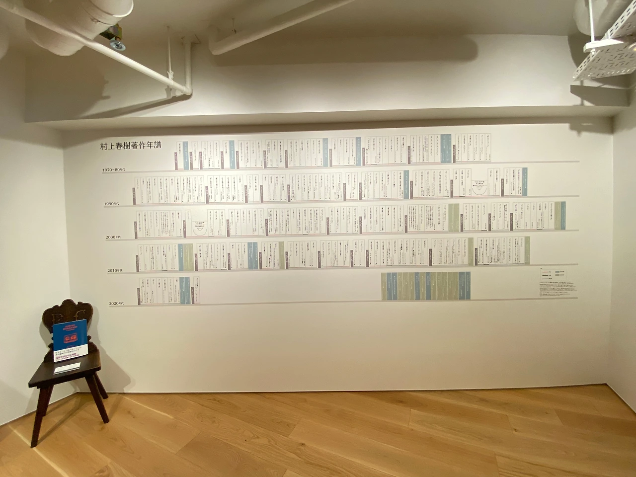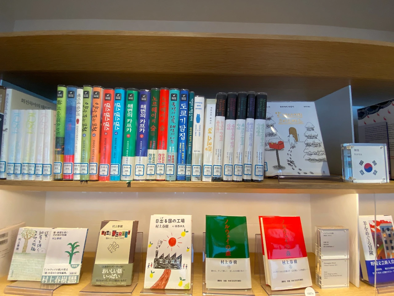 터널을 지나 1층의 예약 확인 데스크에서 입장 태그를 받고 오른쪽으로 돌면 갤러리 라운지가 나온다. 가장 먼저 시원하게 중앙을 가로질러 놓여있는 20미터는 돼 보이는 원목 책상이 눈에 띈다. 그리고 테이블을 기준으로 좌우에 책장을 배치하여 마치 3D 데칼코마니 작품을 보는듯한 공간이다. 오른쪽에는 하루키 책들의 초판본이 진열장 안으로 전시되어있으며 그 위로는 50여 개국의 언어로 번역된 그의 책이 꽂혀 있는데 막강한 팬을 보유한 한국어 책들이 앞쪽에 여러 권 자리하고 있다.