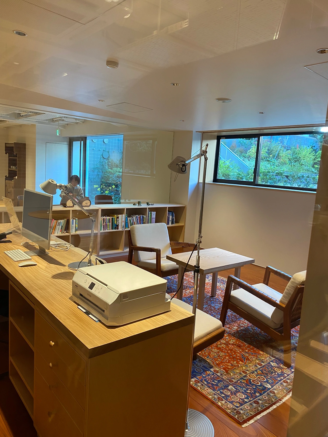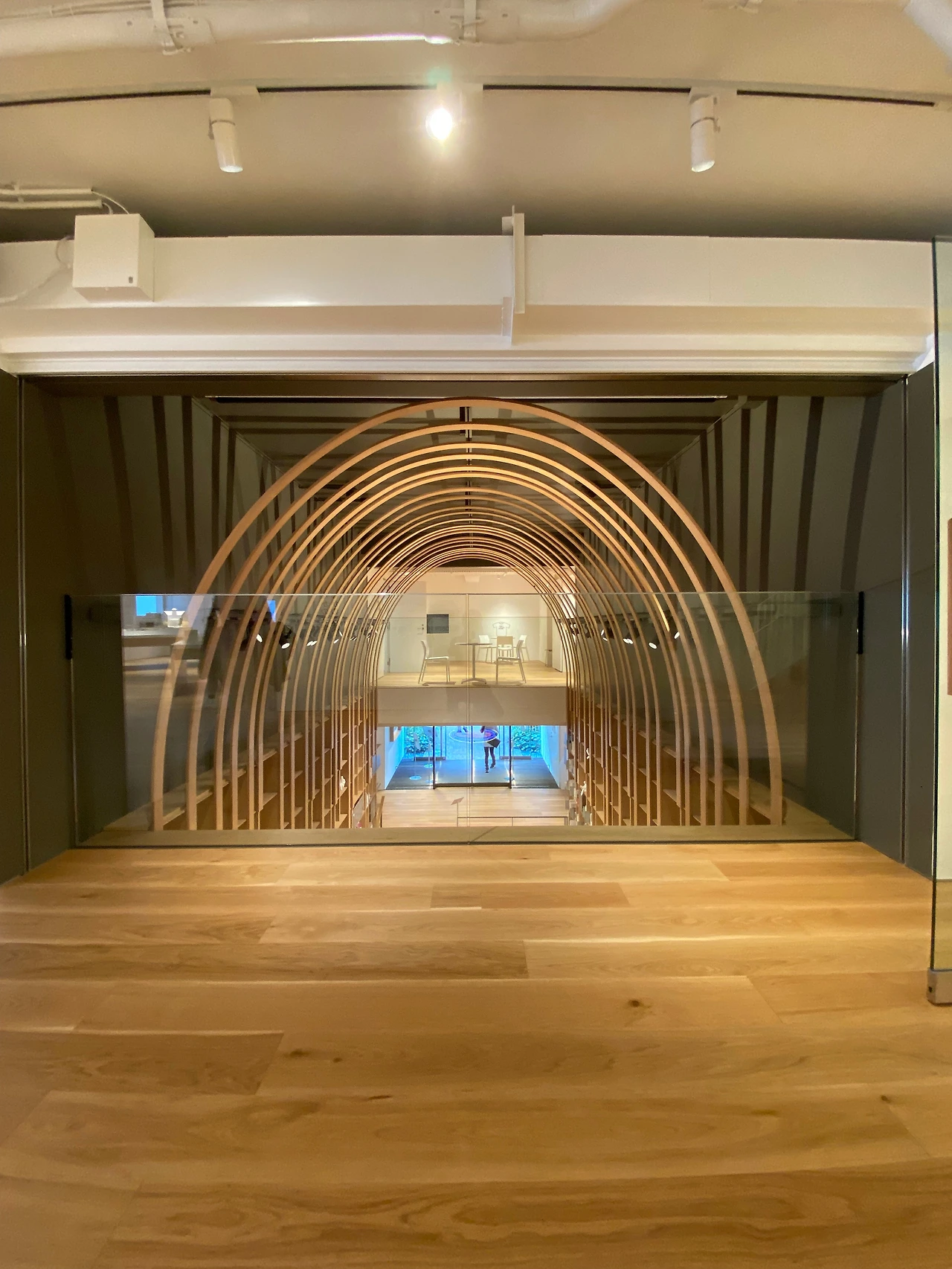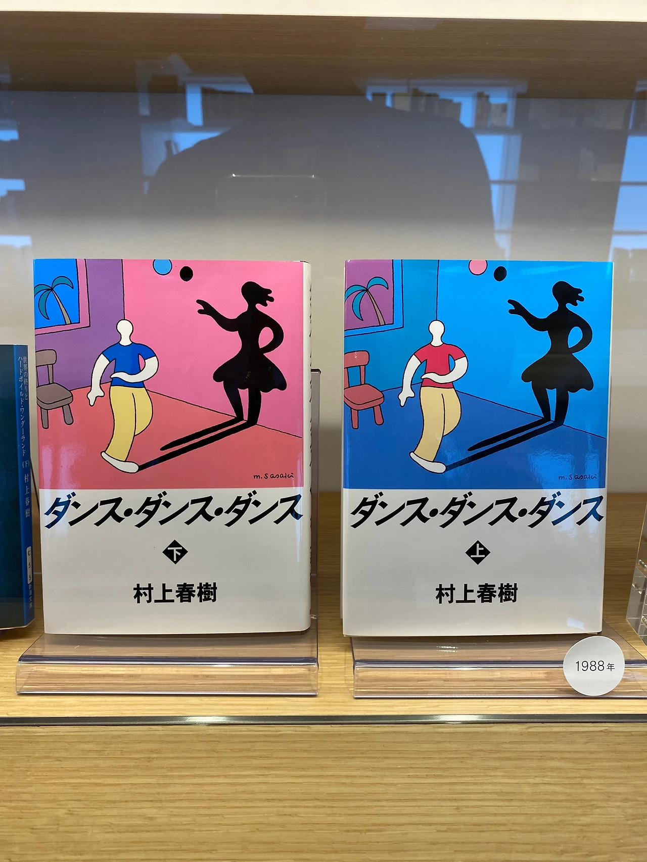 터널을 지나 1층의 예약 확인 데스크에서 입장 태그를 받고 오른쪽으로 돌면 갤러리 라운지가 나온다. 가장 먼저 시원하게 중앙을 가로질러 놓여있는 20미터는 돼 보이는 원목 책상이 눈에 띈다. 그리고 테이블을 기준으로 좌우에 책장을 배치하여 마치 3D 데칼코마니 작품을 보는듯한 공간이다. 오른쪽에는 하루키 책들의 초판본이 진열장 안으로 전시되어있으며 그 위로는 50여 개국의 언어로 번역된 그의 책이 꽂혀 있는데 막강한 팬을 보유한 한국어 책들이 앞쪽에 여러 권 자리하고 있다.