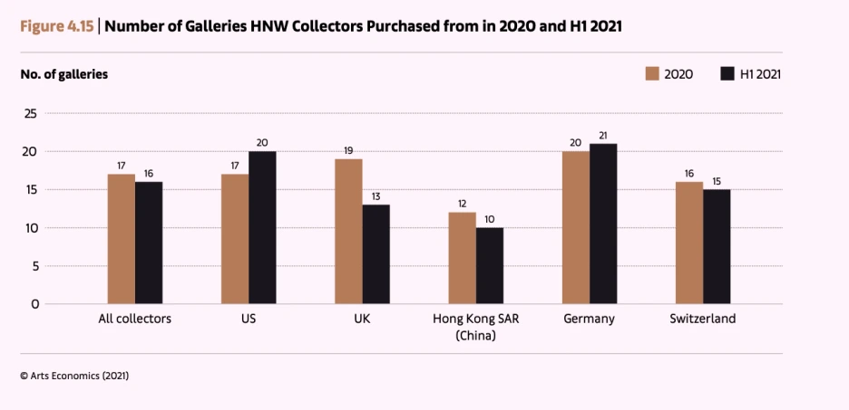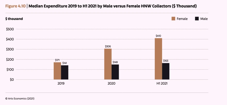 HNW, 고액 상위 컬렉터 집단 중 여성 컬렉터들이 남성들보다 약 두 배의 미술품을 구매를 하였는데, 이는 2020년 대비 1/3이 증가한 $410,000(인당 평균)에 해당한다.