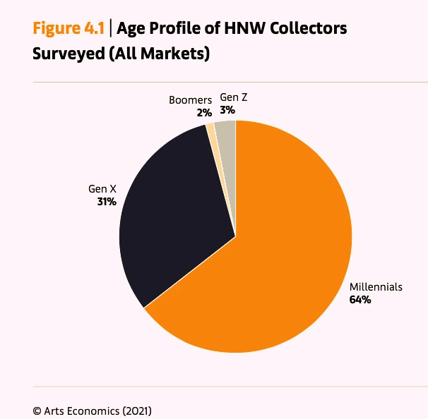 이 증가는 주로 밀레니엄 세대 컬렉터들에 의해 주도되었는데 이들의 소비는 HNW의 타 집단에 비해 3배 정도 높았으며, 이러한 현상은 서유럽 국가들을 중심으로 더욱 두두러지게 나타났다.