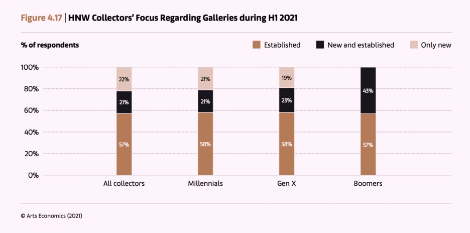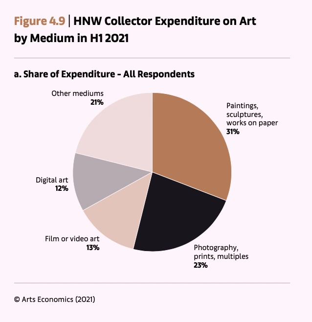 2021년 상반기 HNW 컬렉터들 소비는 31%가 회화, 조각, works on paper에 집중되었으며 디지털 아트는 다소 증가하였지만 전체의 12%에 머물렀다.