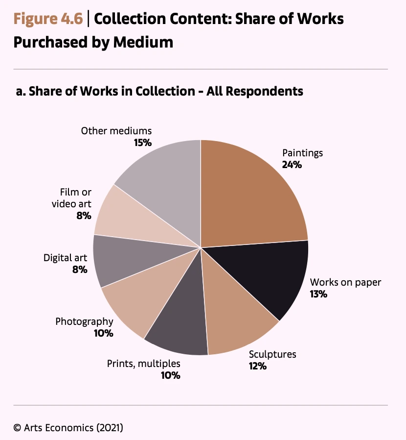 전체 컬렉터의 소장품 분류의 경우 회화와 조각, works on paper의 컬렉션이 47%며 디지털 아트는 8%에 그침.