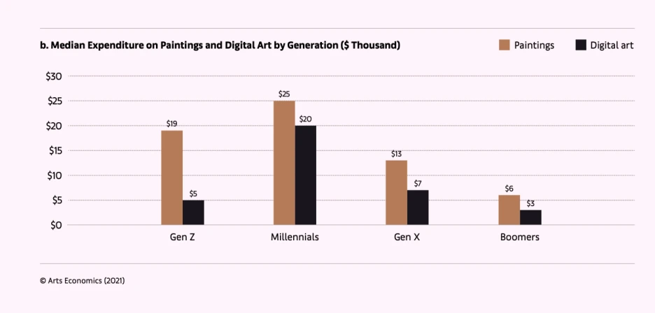 밀레니엄 세대는 모든 미술 분야에 가장 많이 돈을 지출한 집단으로 이 중 디지털 아트에 평균 $20,000을 소비하였다. 한편, 이들 중 48%가 향후 12개월 동안 디지털 아프 작품을 구매하는 것에 관심이 있다고 밝혔다.
