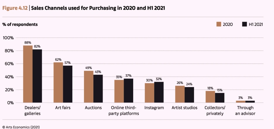 <역시 그림은 온라인으로 사기에는 장벽이 있는 듯, artsy 등과 같은 online third-party 플랫폼들은 작년과 거의 동일한 수준이며, 작가를 통한 구매(인스타그램 포함) 역시 비슷한 수준으로 나타남>