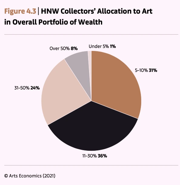 응답자 중 가장 많은 36%가 자신들의 자산 중 미술 작품이 차지하는 비중이 11~30%라고 대답하였으며, 5~10%를 미술 작품에 투자한다는 비율이 31%로 나타났다. 한편 자산의 절반 이상을 아트마켓에 투자하는 상위 컬렉터들도 8%에 달했다.